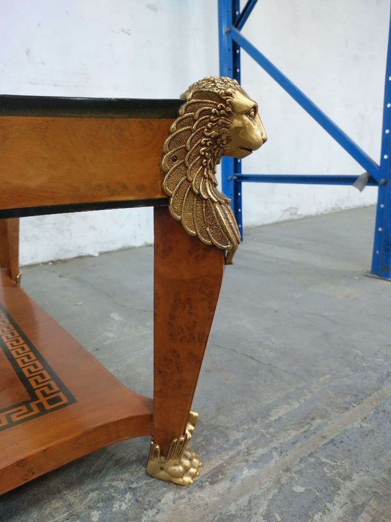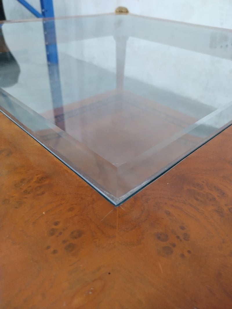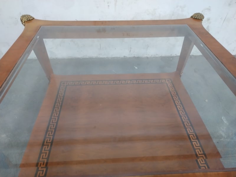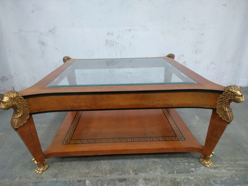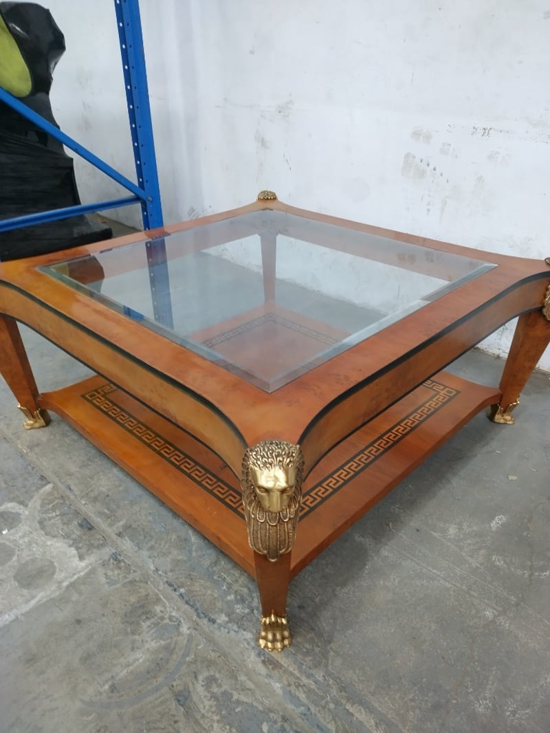 Coffee Table, solid timber frame, Glass top, gold finish metal corner accentsDimensions: H 46cm x W 110cm x D 110cm