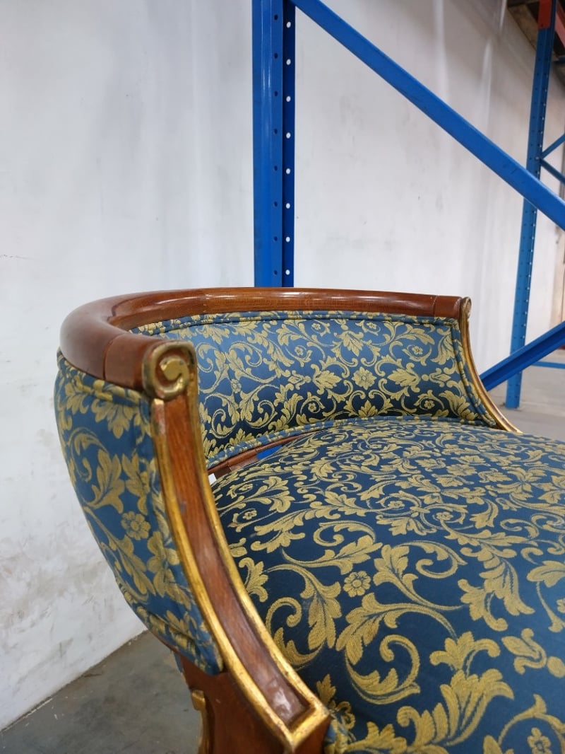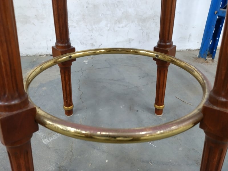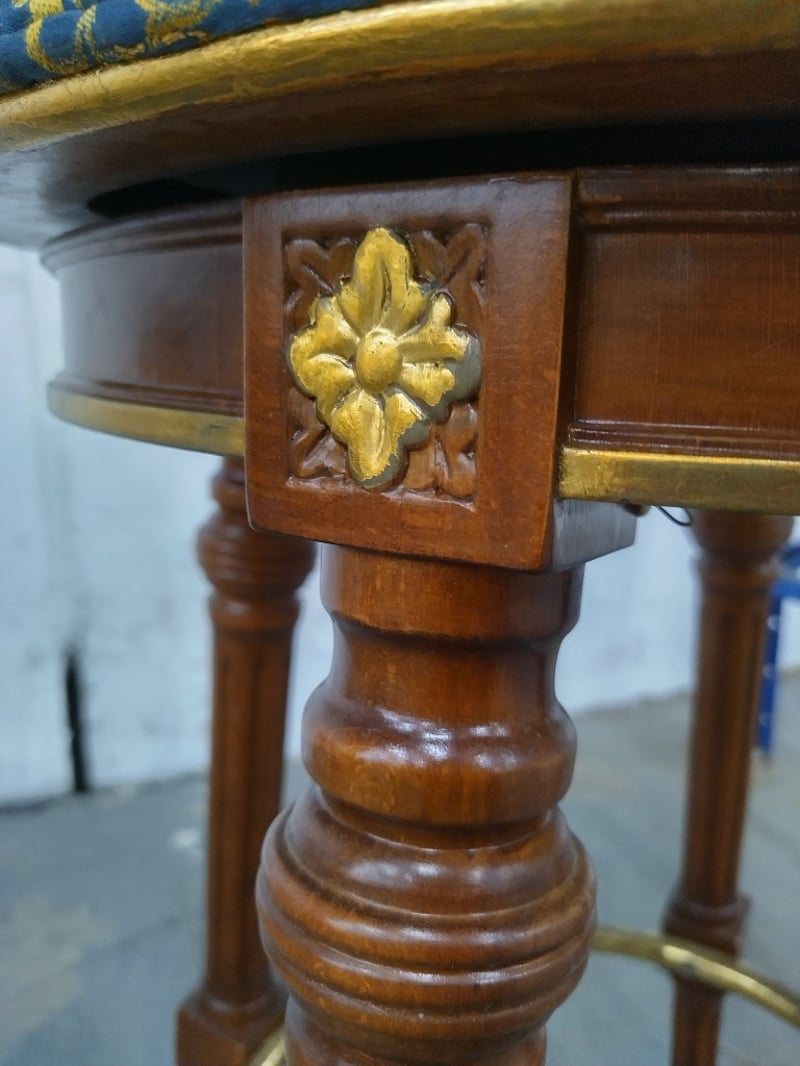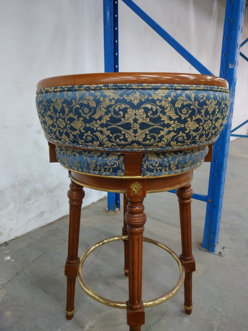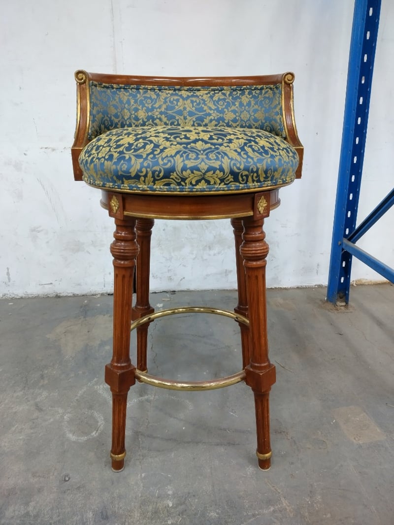 Solid Timber rotating bar chairs, blue patterned finish seating Dimensions: H 91cm x W 53cm x D 55cm BID PER EACH, MUST TAKE 5