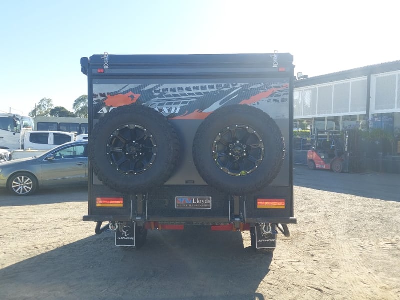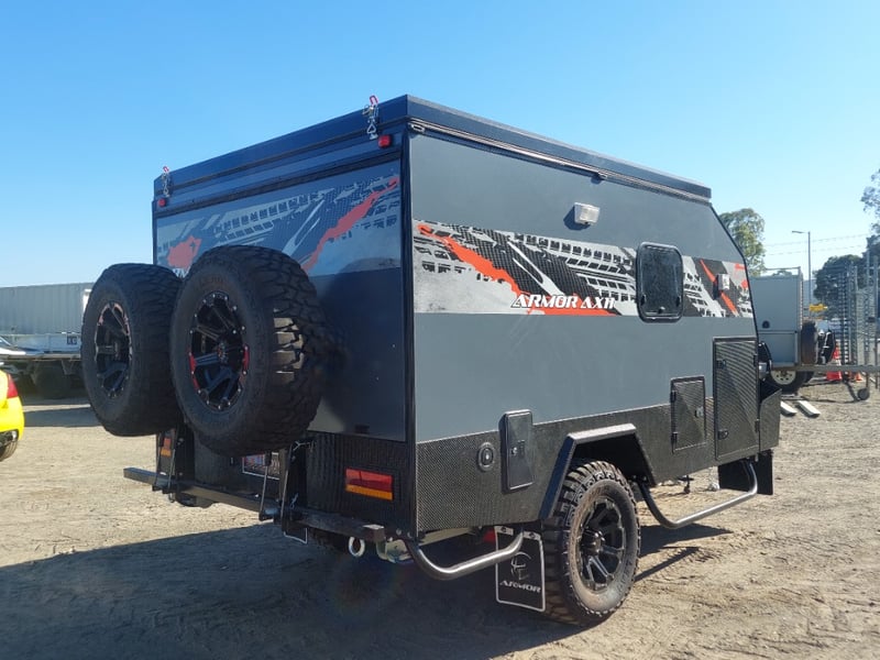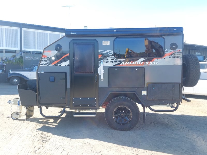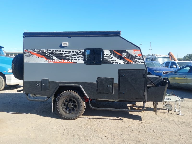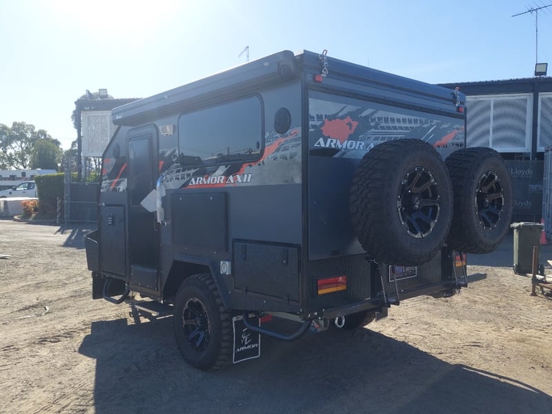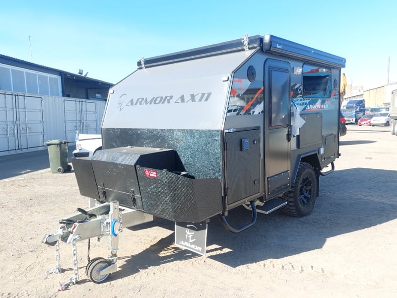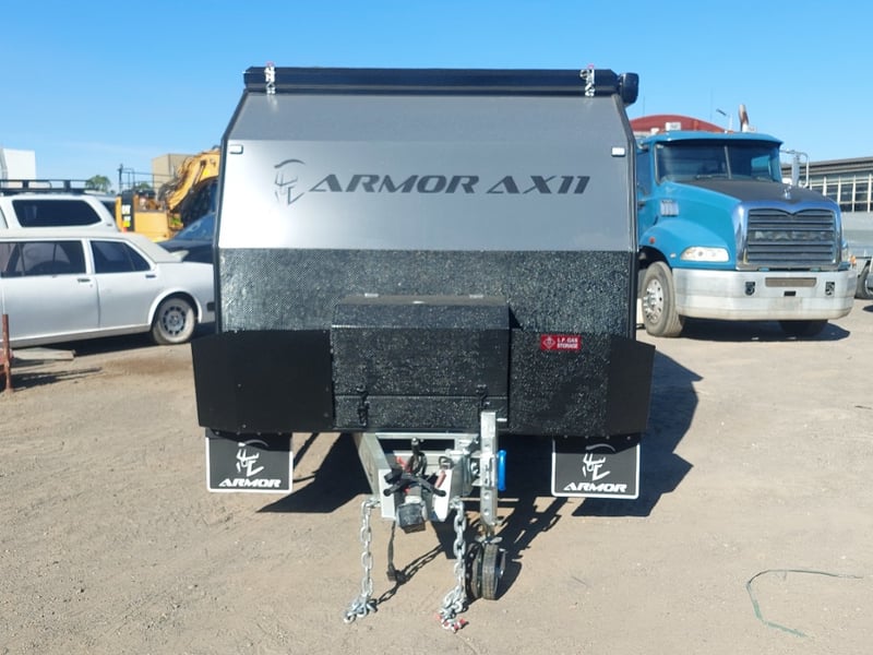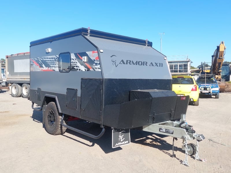 ARMOR AX11 Year: 2025 Make: AX11 Model: Armor AX11 Body: Caravan Colour: Black/Grey Configuration: Single Axle Size: 4800 L x 2150 W x 2350 H mm Tare: 1500 kgs ATM: 2000 kgs Draw-bar: Total Draw-bar size: 2530 mm (includes coupling 2740 mm) Chassis: Extra Heavy-Duty off-road frame Ball Weight: 100 KG TARE Weight: 1500 KG ATM: 2000 KG - Toolbox Size: 450 L x 750 W x 540 H mm - Fridge box Size: 750 L x 480 W x 580 H mm - Suspension: Coil spring, twin shock absorbers, independent trailing arm - Wheels and Tyres: 4 x Alloy Wheels, 2 X Brand New Spare 16” 6-stud Land-cruiser pattern tyres and rims (265/75R16) - Brakes: 4WD 12 inch Electric Brakes plus additional Hand Brake - Coupling: Off-road Heavy-Duty coupling with double safety chains - Finish: Hot-Dip Galvanised steel frame - Jockey Wheel: ARK XO 750 Series heavy duty dual jockey wheel - Jerry Can Holder: 2 x Jerry can holders - Water tank: 80 + 40 Litre water tanks - Gas Bottle holder: 2 x Gas bottle holders (9 KG bottles) • Step: Aluminium stepper 1pc assembled under caravan door • Door: New designing good quality door with lockable security screen door & curtain for privacy on door window, caravan window includes anti-mosquito mesh and shade curtain • Rim: Aluminium black alloy rim • Tap: Good quality hot and cold foldable tap 2pcs • TV: Includes with wall mount. Vin: 6NRCARAVNSS000008 KEY# MMR4 #MMR