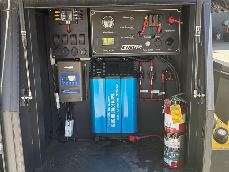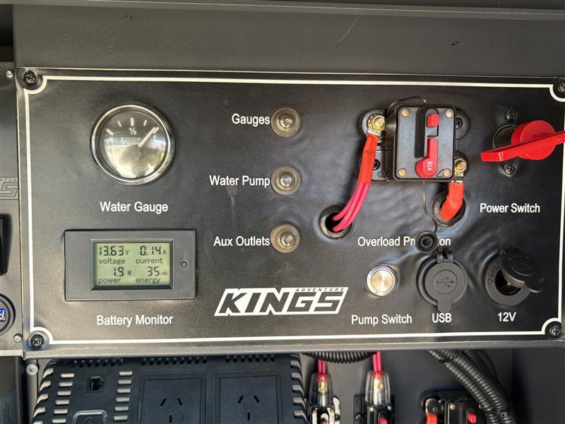 Electrical: Solar Panels, 2 Batteries, Isolator Switches, Master Switch, USB + Cigarette Plugs, 240V Plugs.