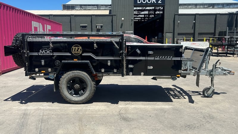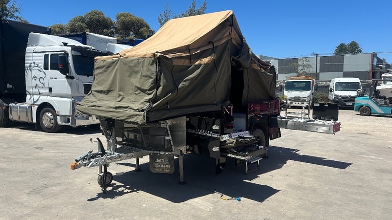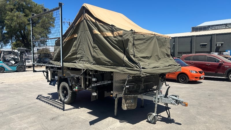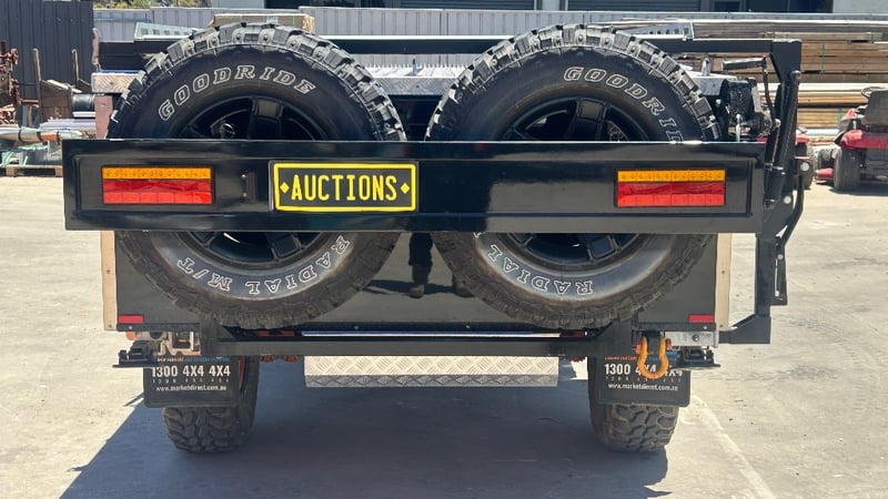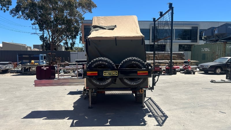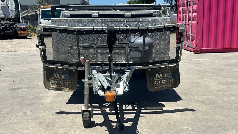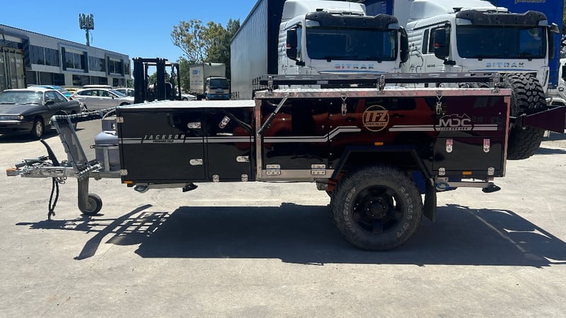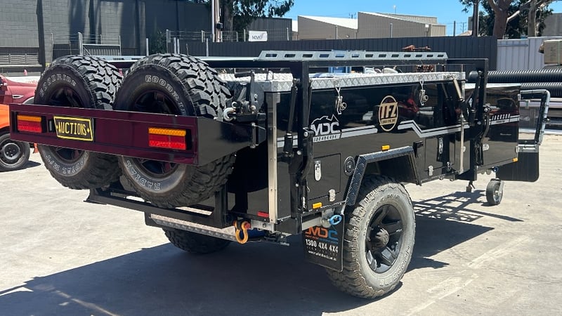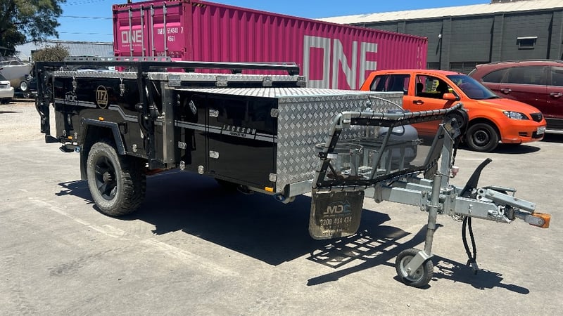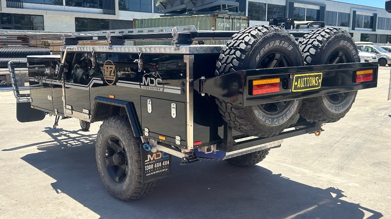 2020 MDC Jackson Forward Fold Camper Trailer Year: 2020 Make: Market Direct Campers Model: Jackson FF Body: Camper Length (overall / travel): ~ 5.30 m Width (body /closed): ~ 1.80 m Height (travel / closed): ~ 1.80 m Colour: Black Configuration: Single Axel Description/ extras: Includes multiple keys & folder, Independent suspension with trailing arms, coil springs, dual shock absorbers. Electric drum brakes + alloy wheels with mud-terrain tyres, suitable for towing on unsealed/rough tracks. Stainless-steel slide-out kitchen (sink + stove/cooktop). Water storage: ~110 L fresh water tank. , Dual Sleeping Areas, + lounge/annexe space including accessories, Solar Power System Including Battery, Panels & 12V Outlets, 1 x Gas Bottle. VIN: 6KSMDCTRLLC001621 GTM: 1805KG ATM: 2000KG Tare: 7500KG Damage: Minor Paint Imperfections refer to images. KeyNo: C45 #MMR