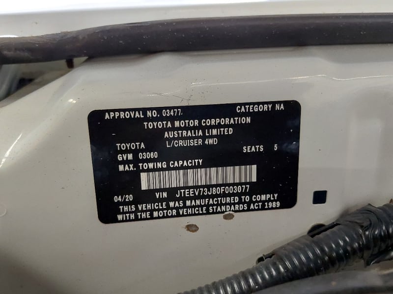 2020 Toyota Landcruiser VDJ76R Year: 2020 Make: Toyota Model: Landcruiser Series: VDJ76R Body: 4-Door Wagon Drive Type: Four wheel drive Odometer: Indicating 94,258 Kilometers Engine: 4.5 V8 Turbo Diesel Transmission: 5-Speed Manual Colour: White Seats: 5 Description/extras: Air Conditioning, SRS, Leather interior, Alloy wheels, CD player. ABS Sensor light on, Traction control light on dash, rust evident - REFER TO PHOTOS 2x Keys Price Guide - $43,800 - $51,200 (Based on Unmodified Vehicle) VIN: JTEEV73J80F003077 ENG No: 1VD0534018 (as per PPSR) #PCV (Key #MMRP13 Marple) Lloyd's stock #581033+1