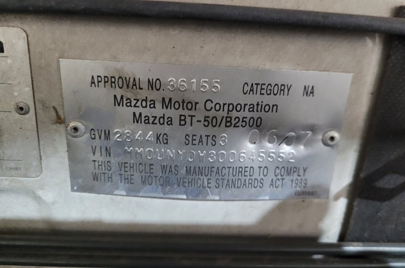 2007 Mazda BT-50 UN DXYear: 2007Make: MazdaModel: BT-50Series: UNBadge: DX Body: Single Cab ChassisDrive Type: Rear wheel driveOdometer: Indicating 353,151 KilometersEngine: 2.5 DieselTransmission: ManualColour: WhiteSeats: 2Description/extras: Air Conditioning, SRS, Tinted windows, Towbar, Central locking. UHF , Ex Telstra Ute Vendor advises: Engine replaced 60,000km VIN: MM0UNY0W300645552ENG No: WLAT815698 (AS PER PPSR)(Key #PCV21)Lloyds stock #153908+2#PCV