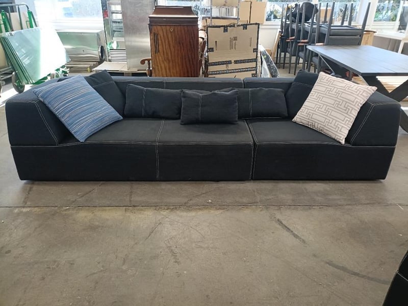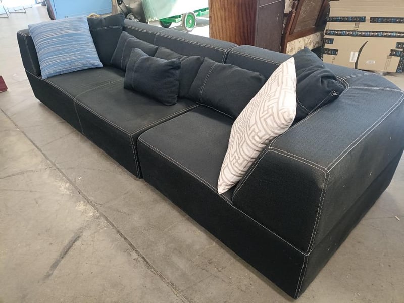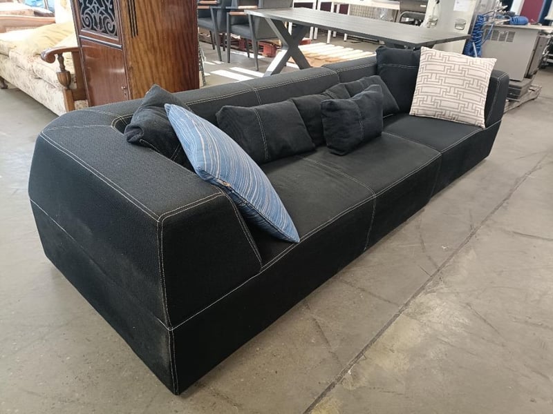 3 Seater Couch, Upholstery, Black, White Stitching, Assorted Pillows Dimensions: (H)65cm x (W)286cm x (D)95cm Note: Signs of wear, Pillows/Cushion Styles/Quantities & Colours May Vary.