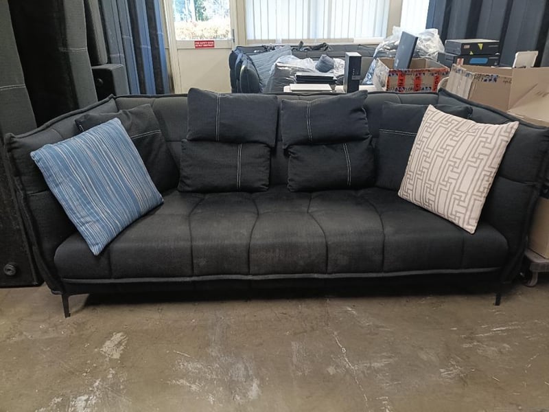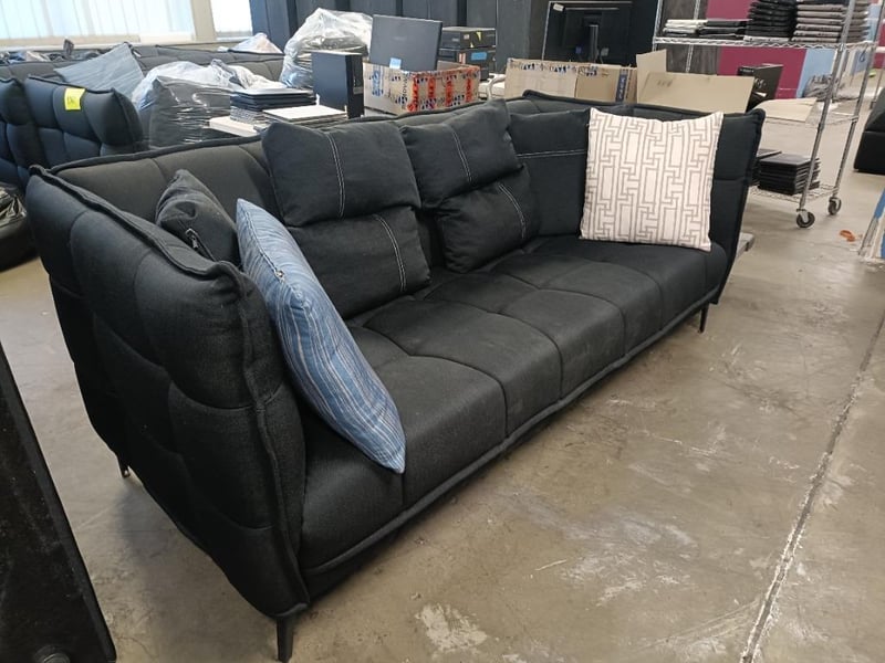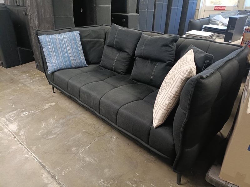 Two Seater Couch, Upholstery, Steel Legs, Black, Assorted Pillows Dimensions: (H)90cm x (W)215cm x (D)105cm Note: Signs of wear, Pillow/Cushion Styles/Quantities & Colours may vary