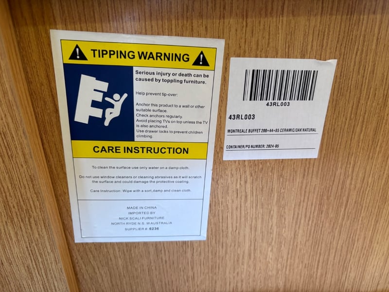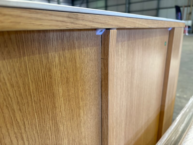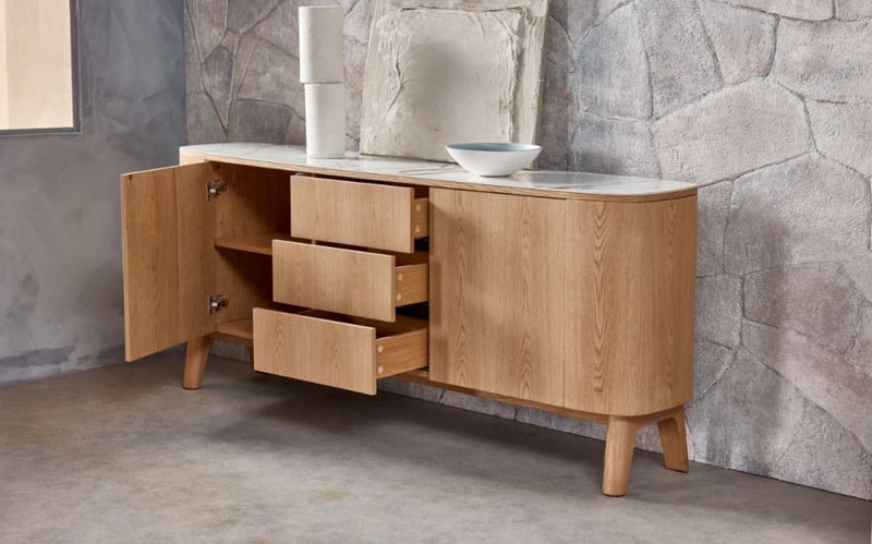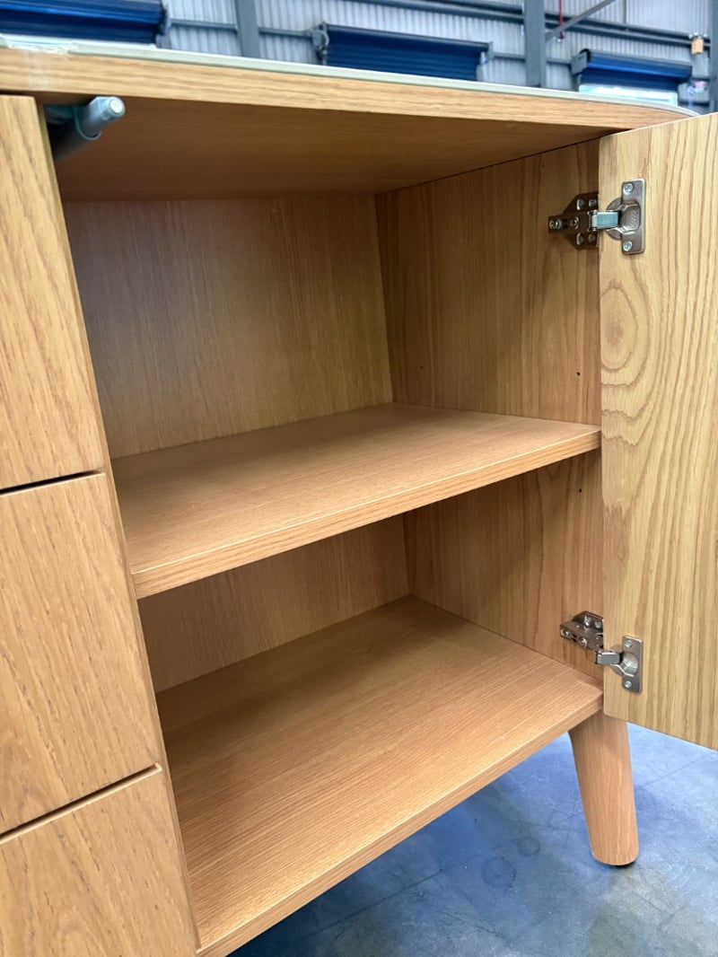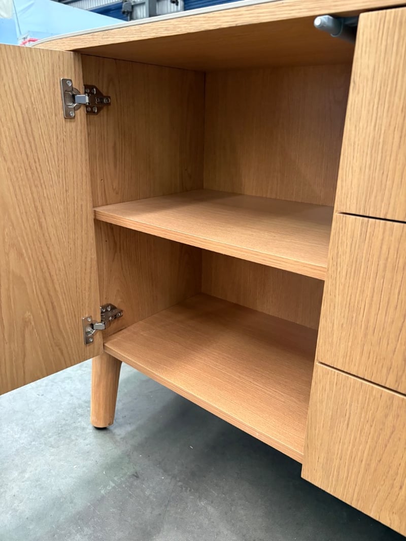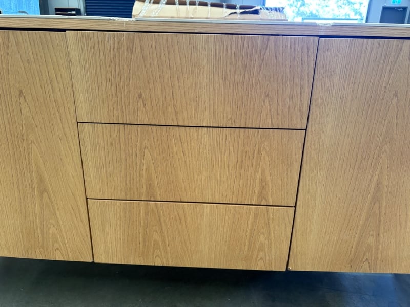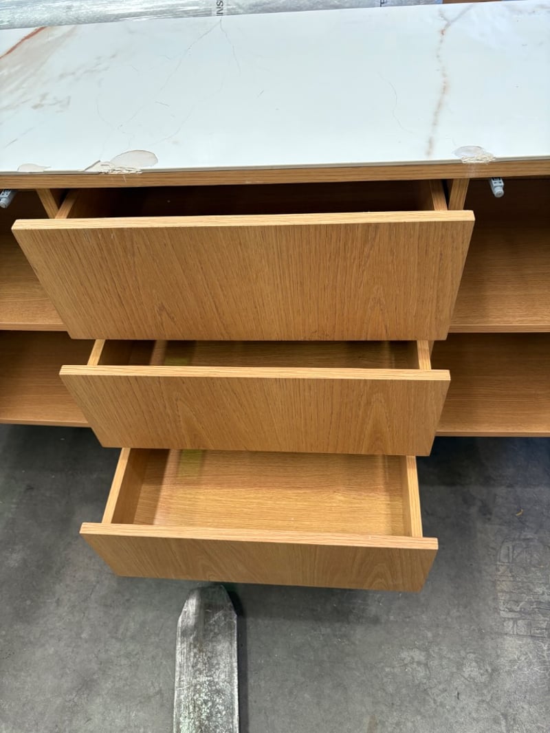 RRP$3290. Buffet. Oak Timber Style with Ceramic Style Top. Dimensions : L200cmxH85cmxD44cmNote: Top is cracked and chipped, and there is some damage to body of item. Inspections Recommended.