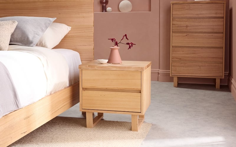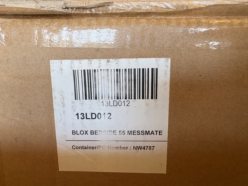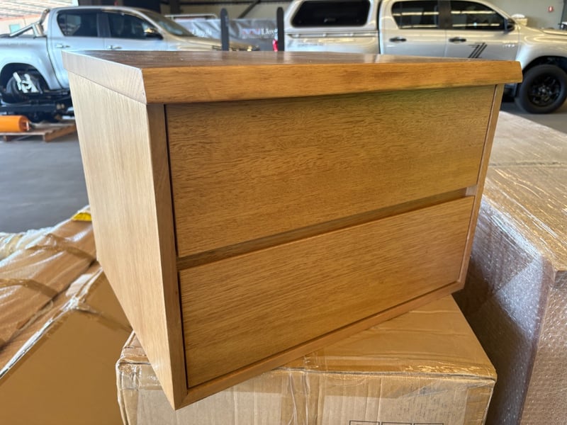 RRP$790 Bedside Table. Timber Style with Angular Legs. Dimensions : 58.5 × 50.5 × 42.5 cm (packaging); approximate finished size ~ 55 cm (W) × 47 cm (D) × 54 cm (H).