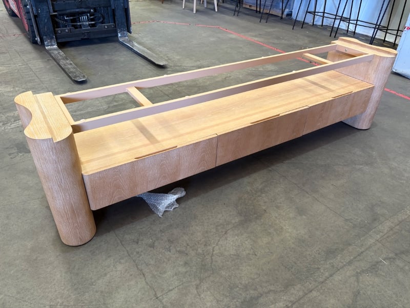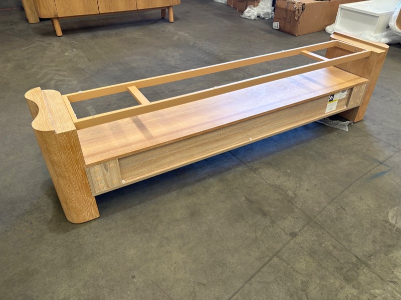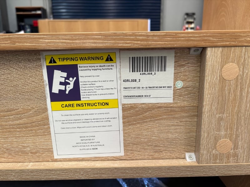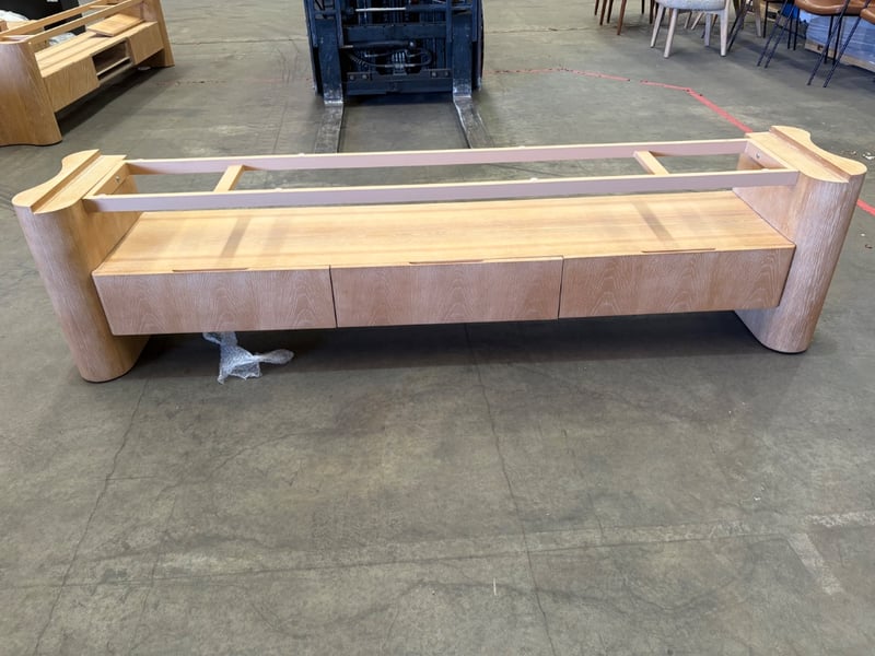 RRP$2890. Tv Entertainment Unit. White washed oak timber with marble style top. Package Dimensions 215x52x10, 227.5x51.5x64