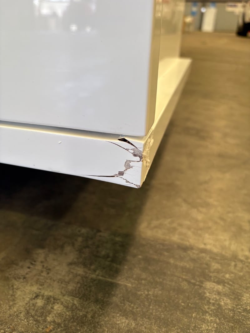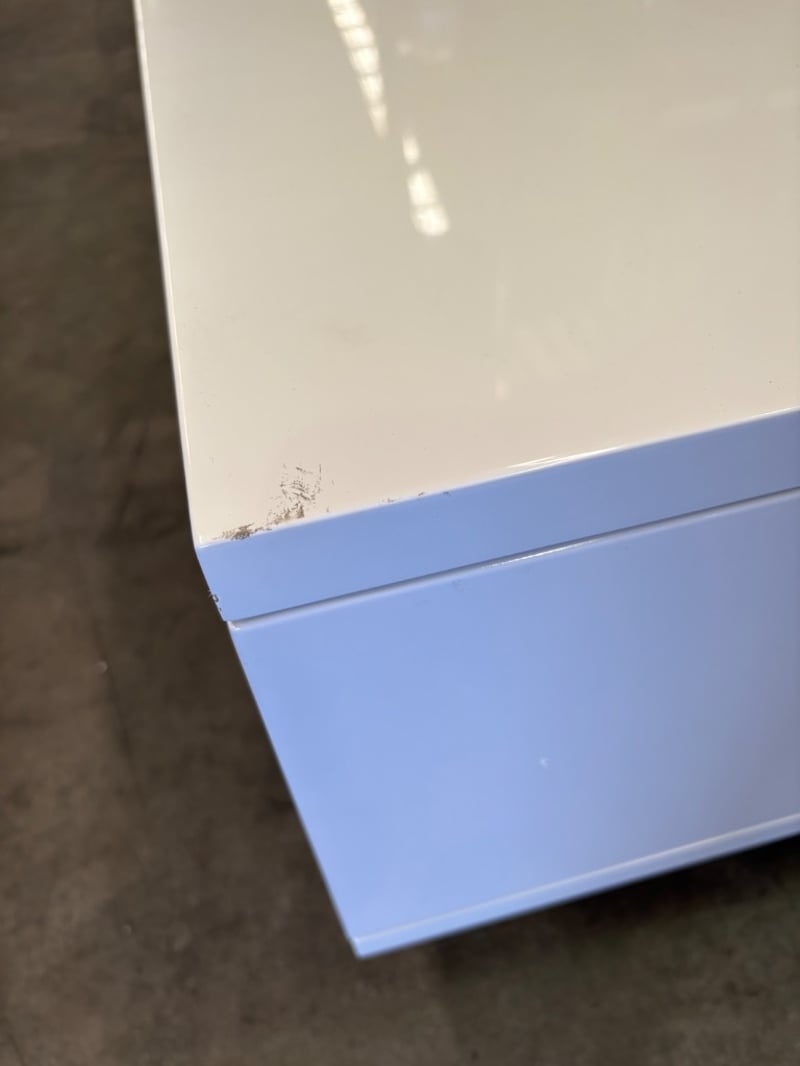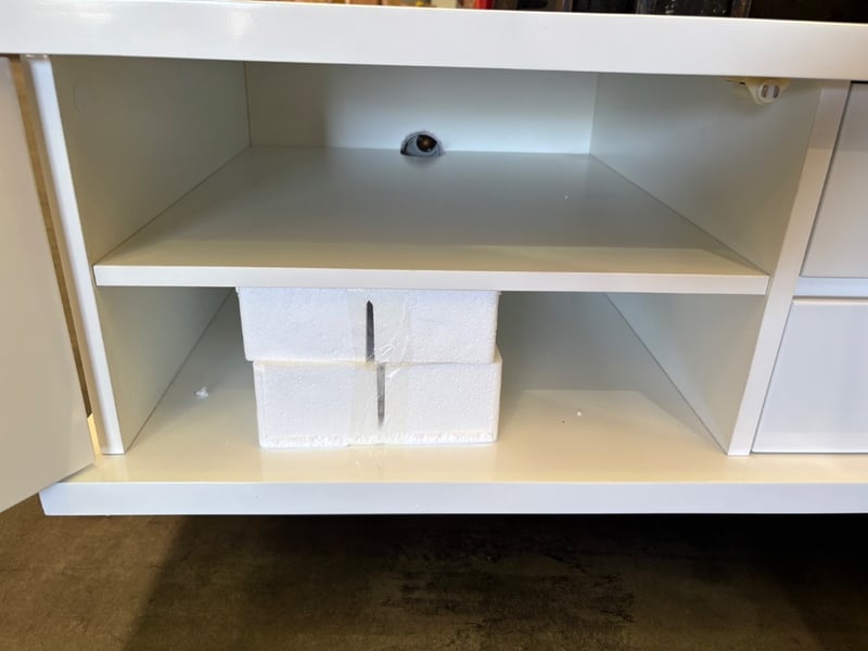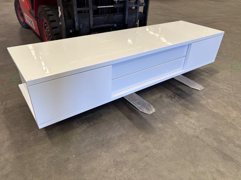 TV Entertainment Unit. White Gloss Finish with Recessed Cupboards and Drawers. Note some damage to unit. Inspections Recommended. Legs not attached but available.