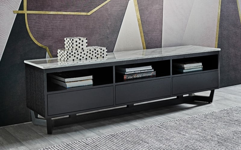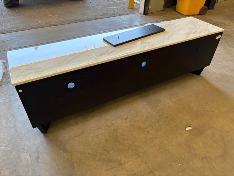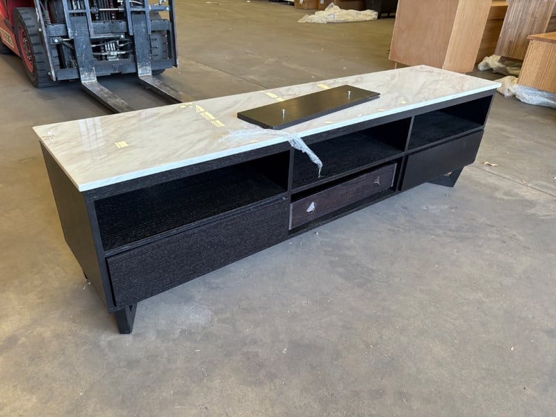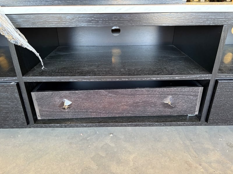 RRP$2690 TV Entertainment Unit. Solid Black Washed Oak Style Frame with Marble Style Top.