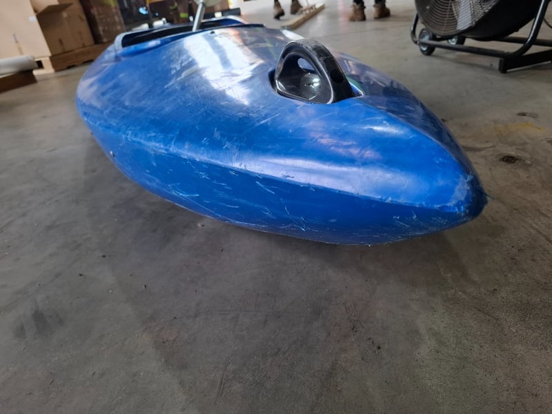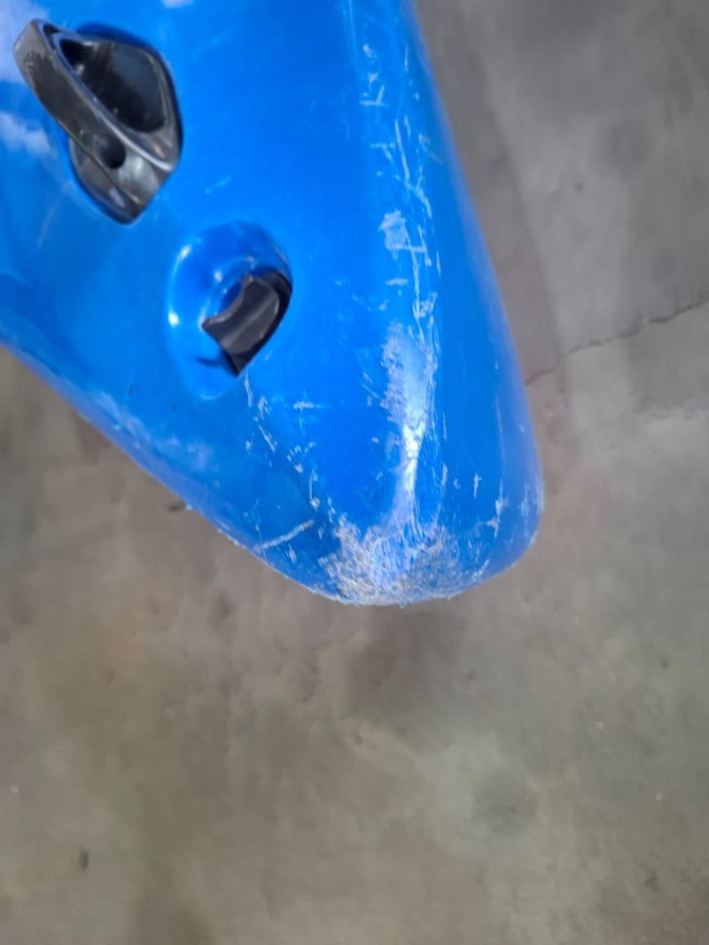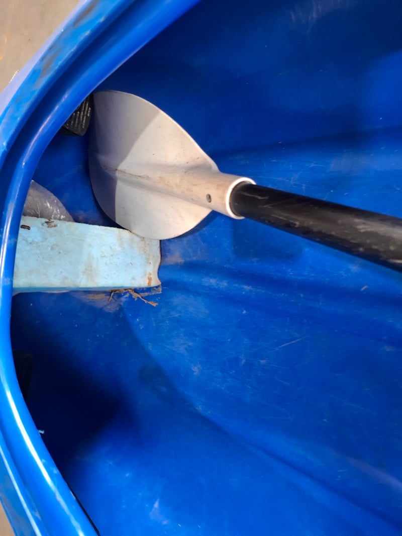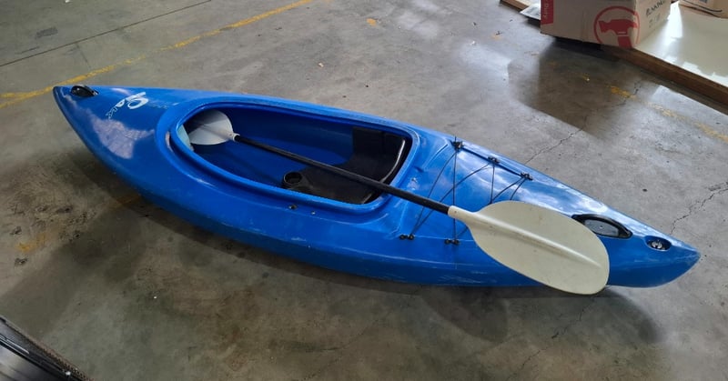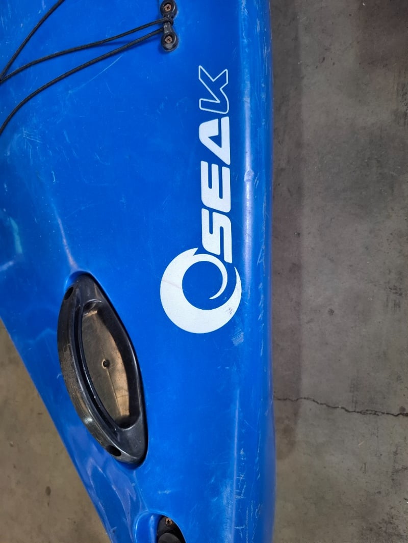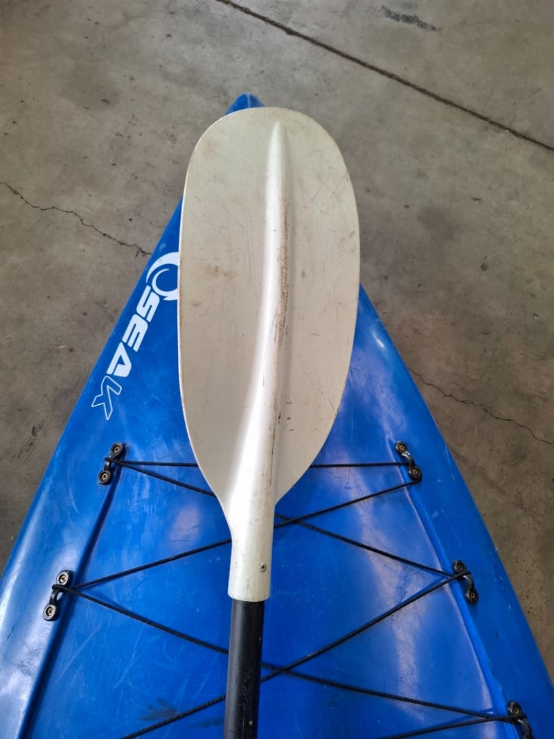blue Seak brand kayak and 218 cm paddle Dimensions: 300 cm L x 75 cm W x 32 cm H