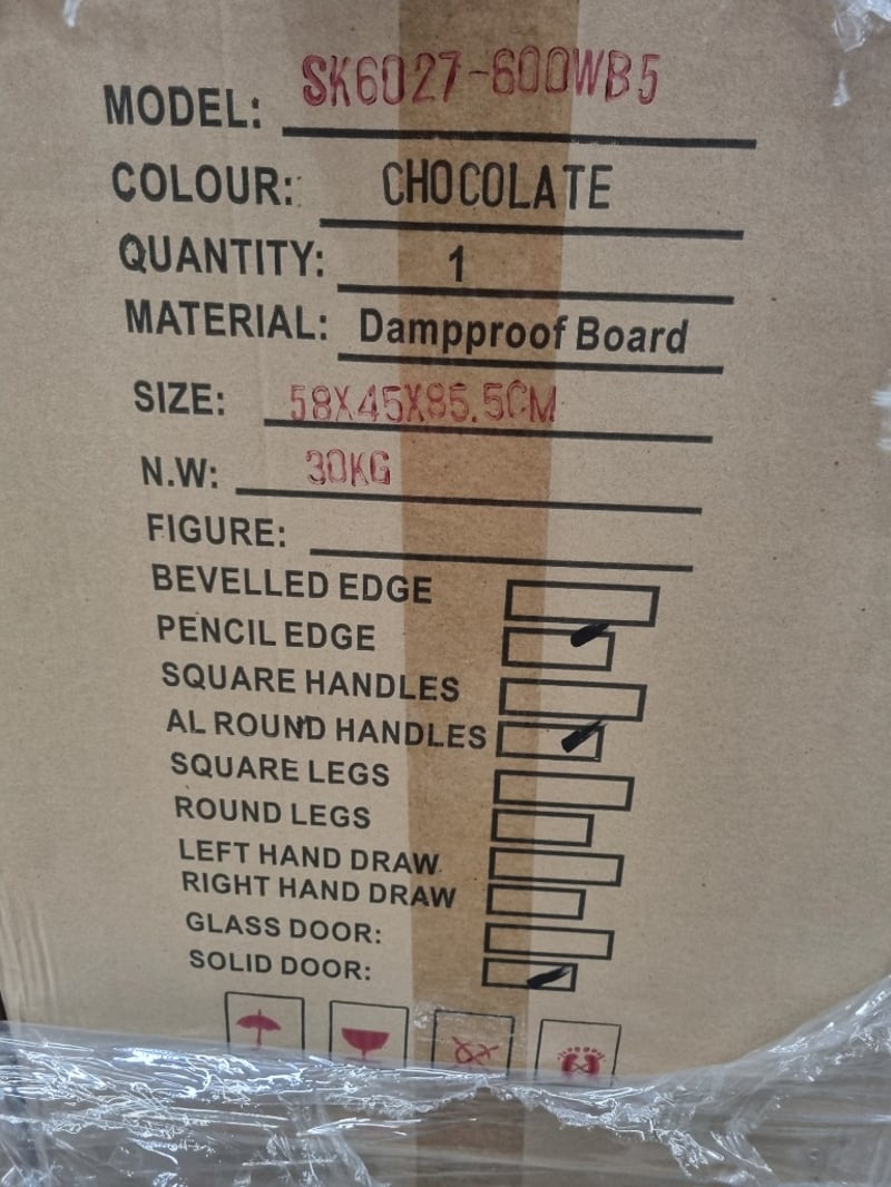 RRP: $2200 Vanity, Sunny group, SK6027-600WB5, Chocolate Note: Vanity Only NO TopDimensions approx; 58X45X85.5CMQuanity 4 to pallet Sold as lot