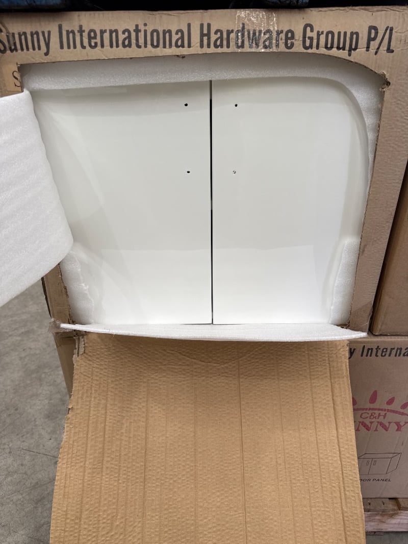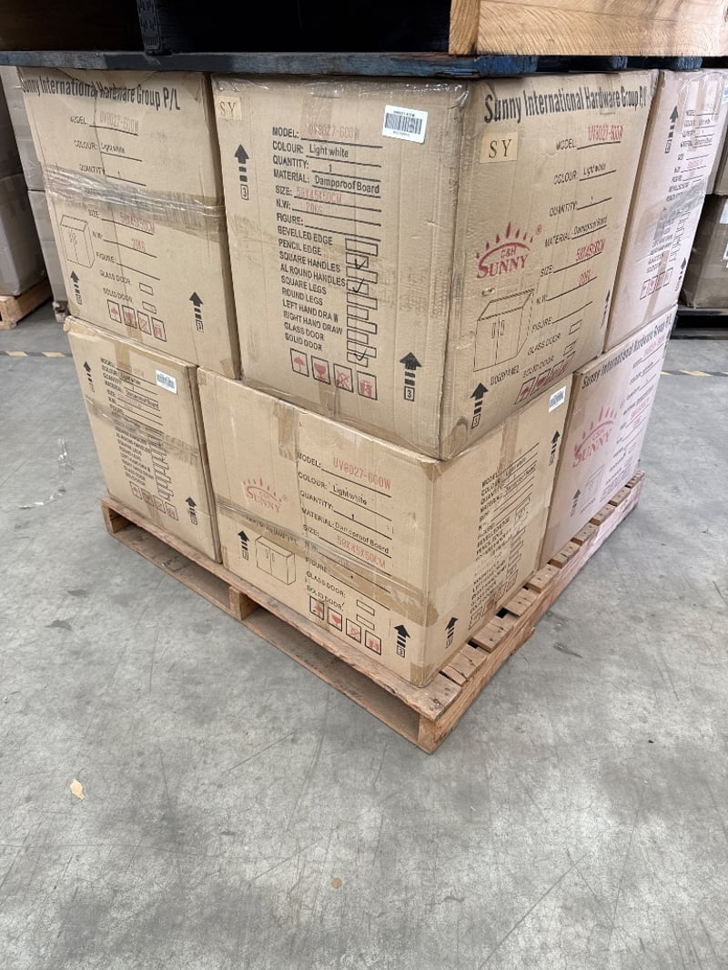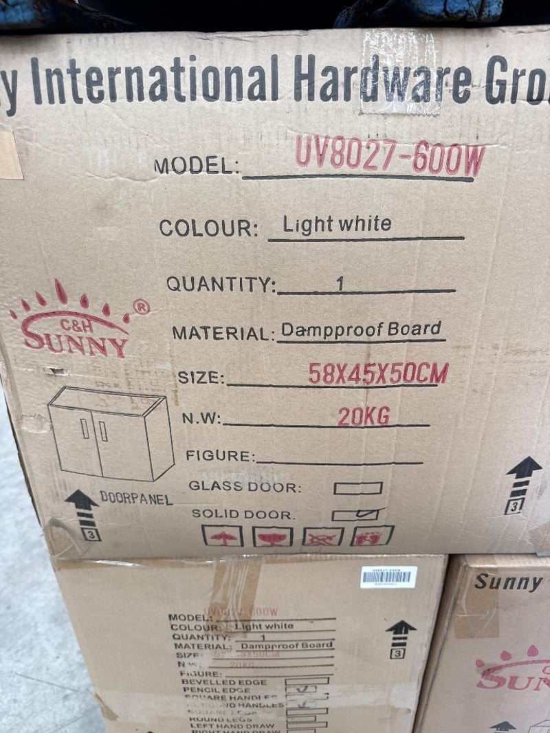 RRP $3080, Vanity, Sunny Group, UV8027-600W, Colour-Light White, 2 Doors. NOTE: VANITY CABINET ONLYApprox Dimensions-58x 45x 50 CM. Quantity-8 to pallet. Sold as lot.
