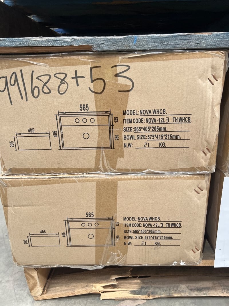 Basins, SI, NOVA WHCB, square, white Dimensions approx; 56.5 x 40.5 x 20.5 cmRRP $2994.5Quantity; 10 to pallet, sold as lot