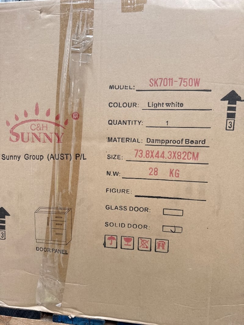Vanity, Sunny Group, SK7011-750W, Light White. Dimensions approx- 73.8X44.3X82CMQuantity- 5 to pallet. Sold as lot.