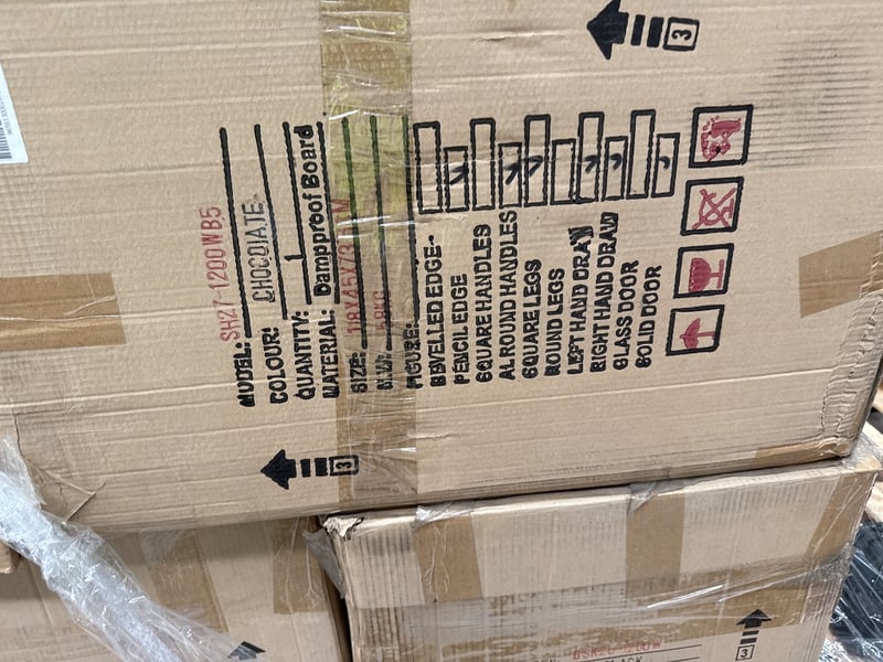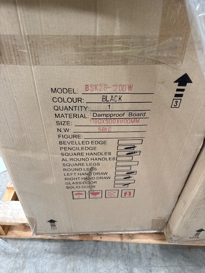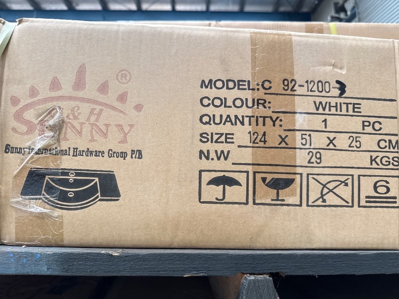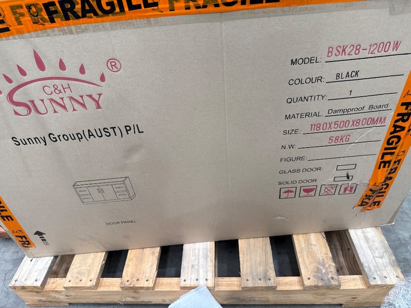 Vanity/ Sink, Sunny Group, Assorted Models including BSK28-1200W and C 92-1200. Assorted colour including Black, White and chocolate. Quantity-4 to pallet, Sold as lot