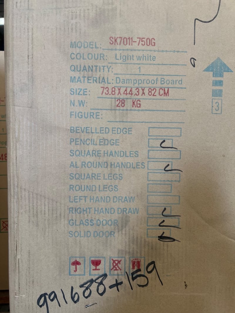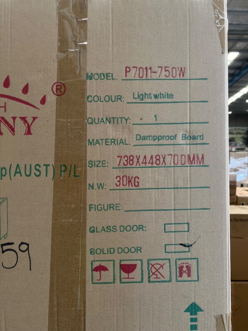 Vanity, sunny group, models include; P7011-750W, SK7011-750G, whiteQuantity; 3 to pallet, sold as lot