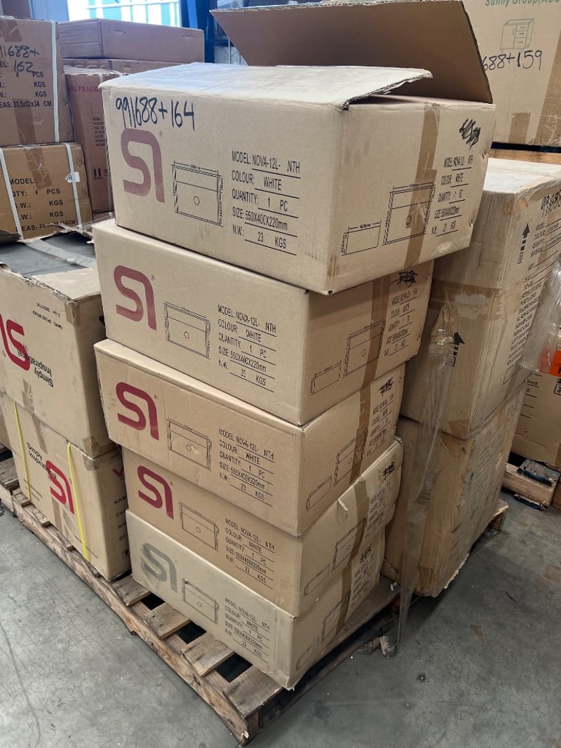 Assorted bathrooms amenities, brands include; sunny group, SI, models include, NOVA-12L-NTH. SIS3171BT, P8011-1200W, includes; basins, vanity, mixers Quantity to pallet