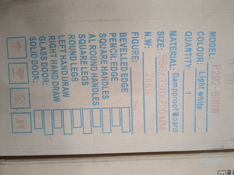 Vanity, sunny group, assorted models include; P292-600W, P392-600G, P192-600W, Light white Quantity; 4 to pallet, sold as Lot