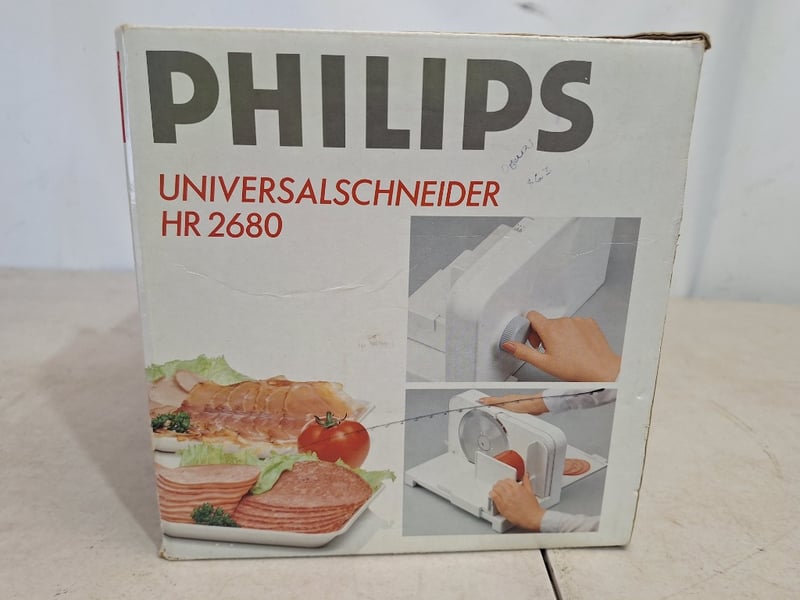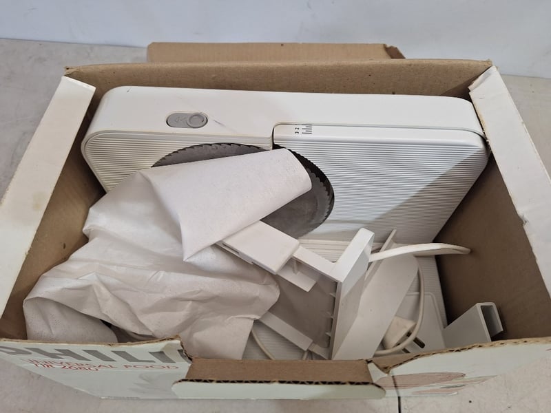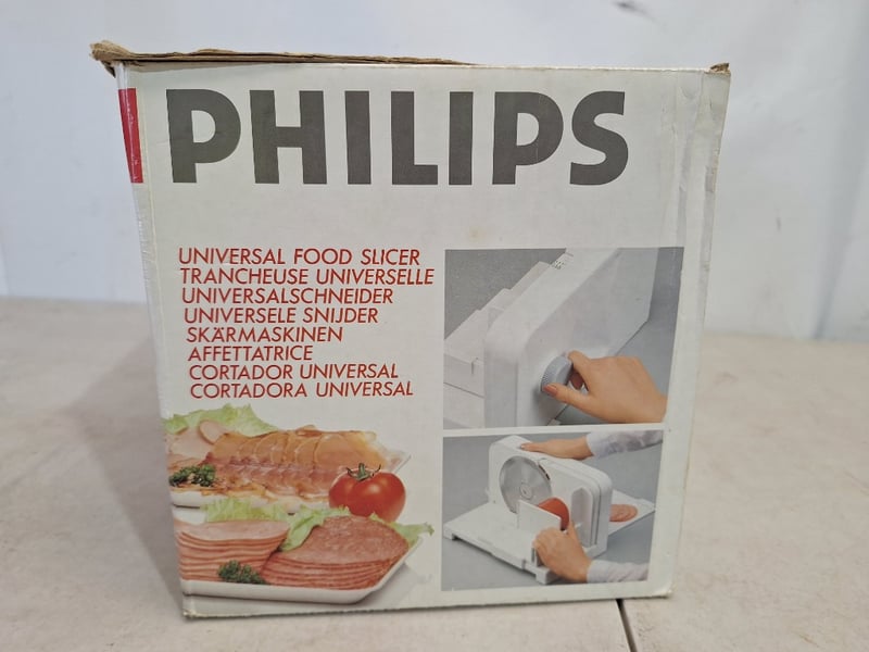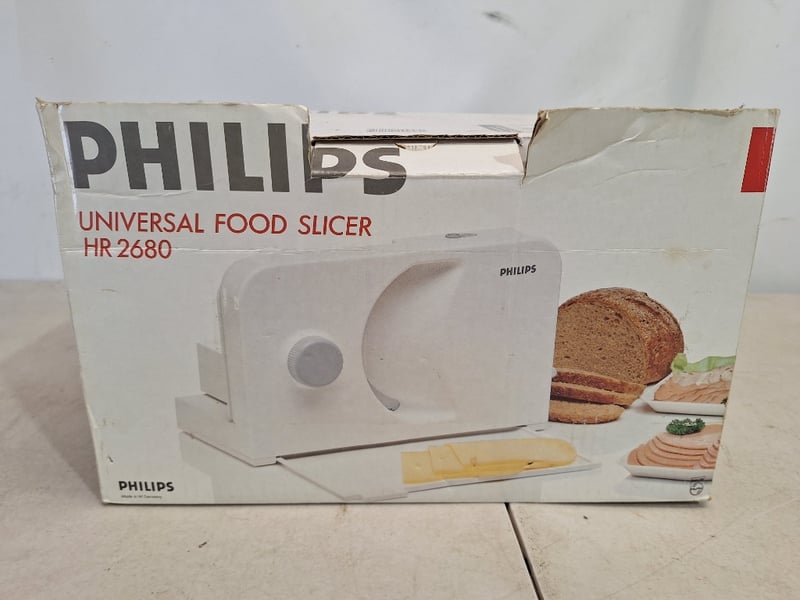 **UNRESERVED** Philips Universal Food Slicer, Model HR 2680, White FinishDimensions Box H:22cm W:35cm D:21cm