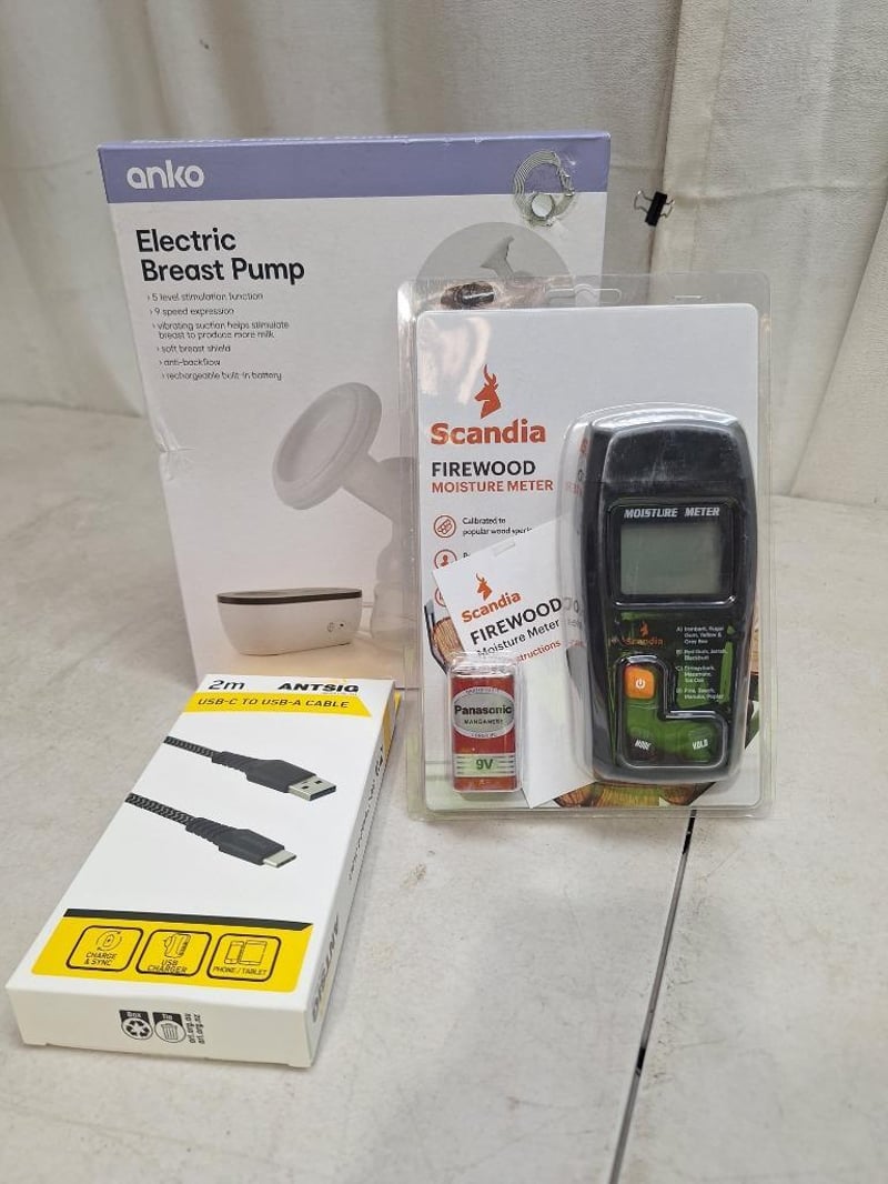 **UNRESERVED** 1 X ANKO Electric Breast pump, NEW factory sealed in box, 1 x SCANDIA firewood moisture meter, NEW factory sealed in packet, 1 x ANTSIG 2M USB-C to USB-A cable, AP577, NEW factory sealed in box