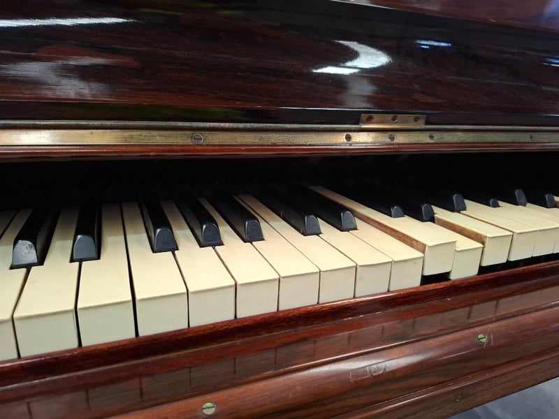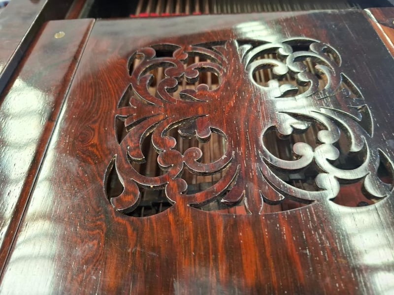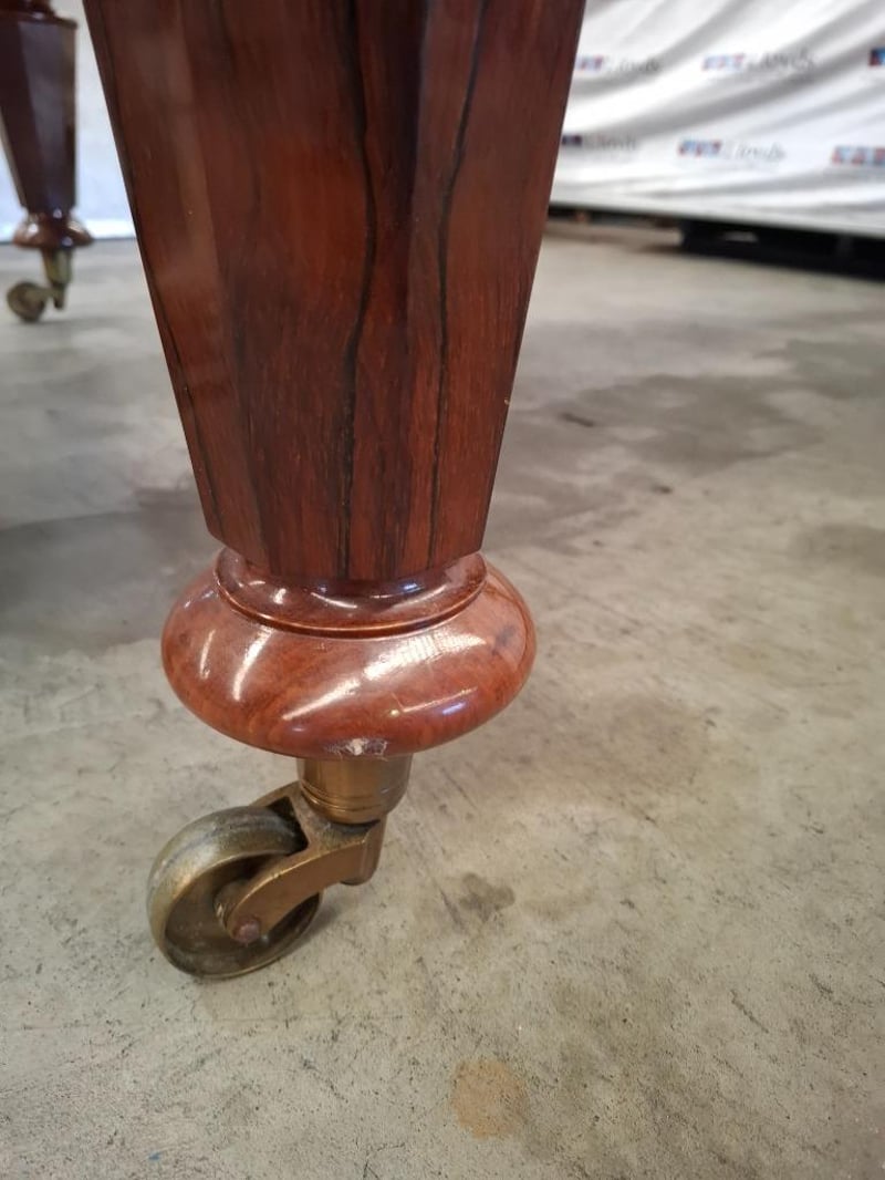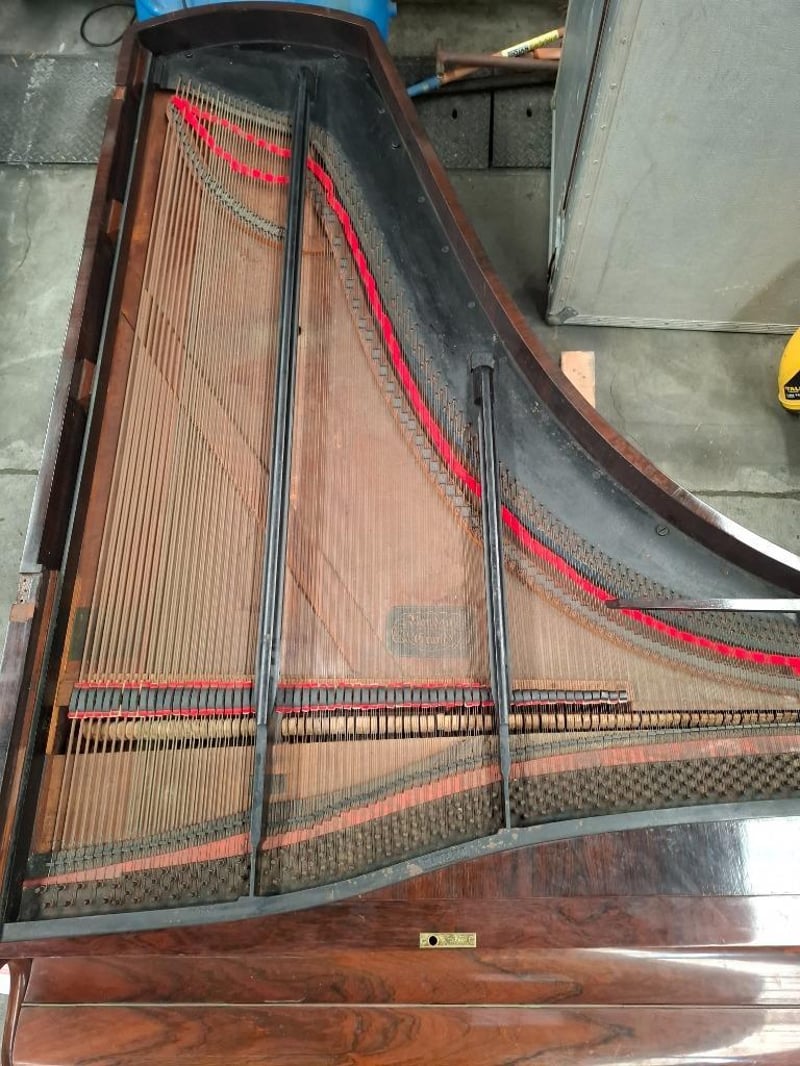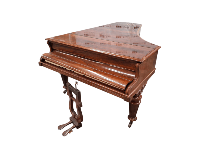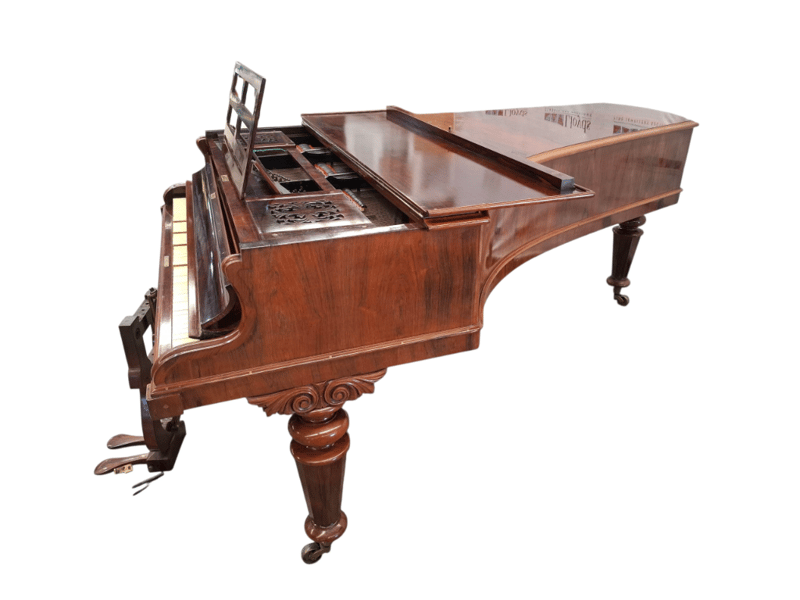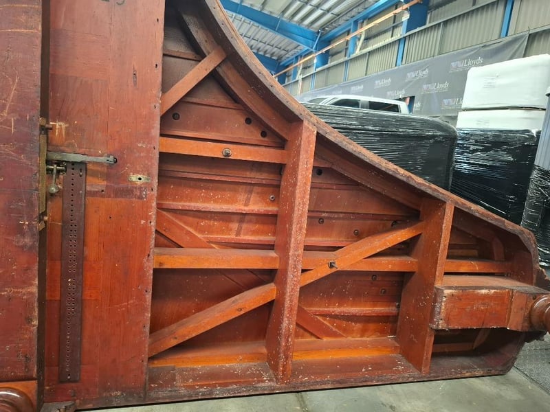 VINTAGE GRAND PIANO Item Size: Height: 95cm, Width: 135cm, Depth: 212cm, Weight: 300Kg Dark Wooden Case, Ornate Music Stand, Brass Castor Wheels, Disassemble Parts, Condition: Fair - Refer To Images