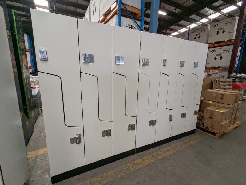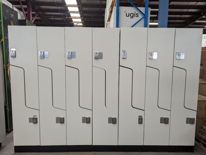 Office furniture - 7x secure storage lockers, white, steel with digital keypad access, comes with wooden stand.