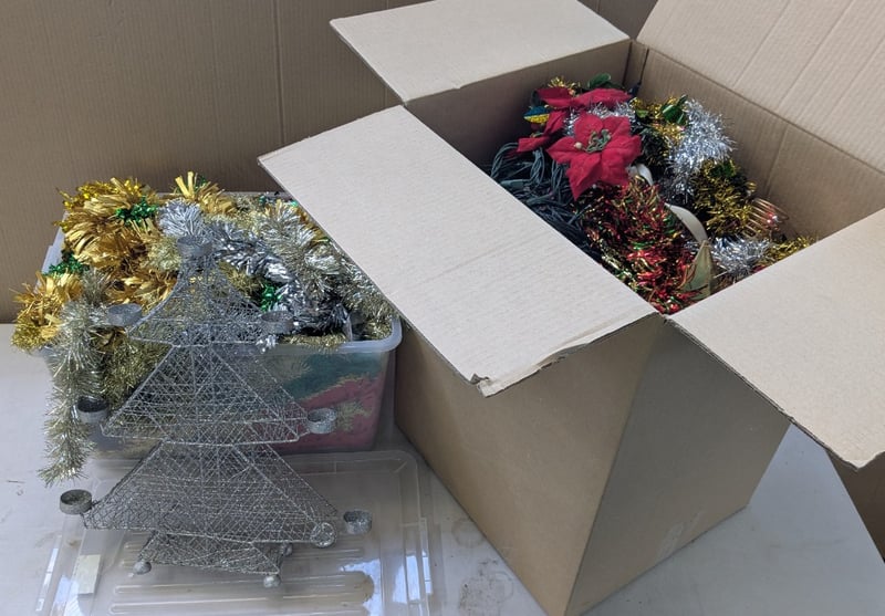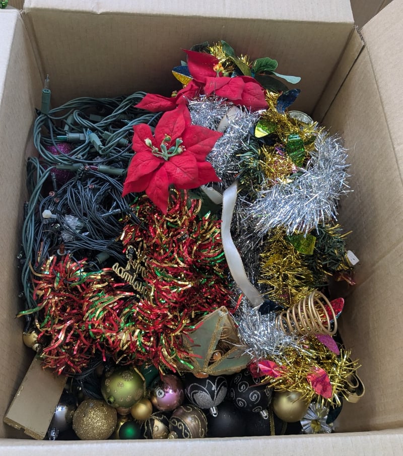 Christmas Decorations, Assorted Christmas Decorations Including lights, Tinsel, Ornaments and more Sold as lot