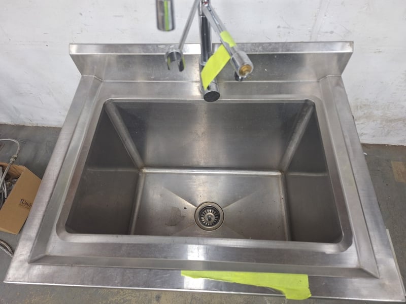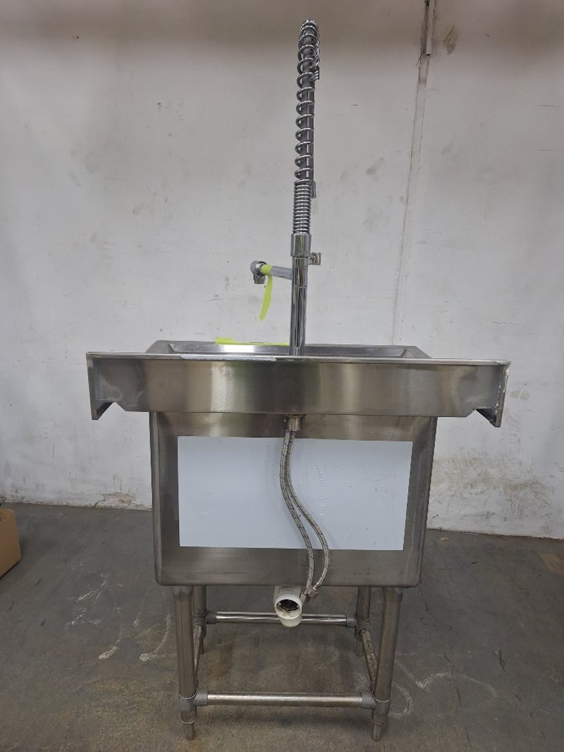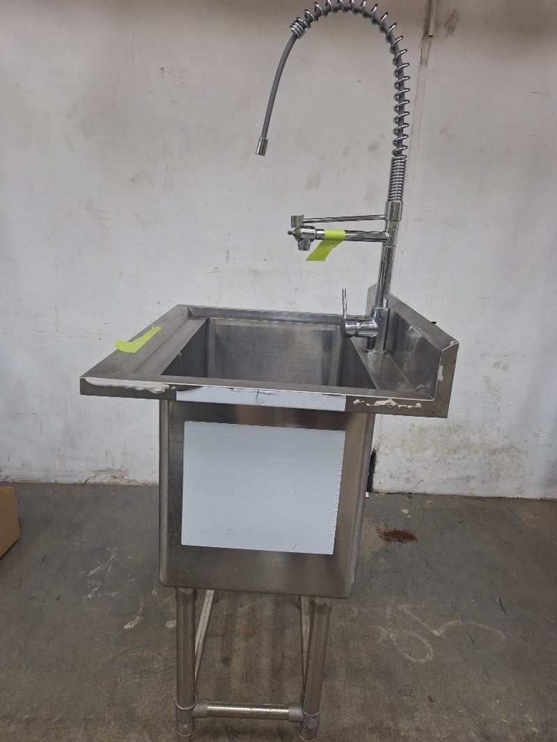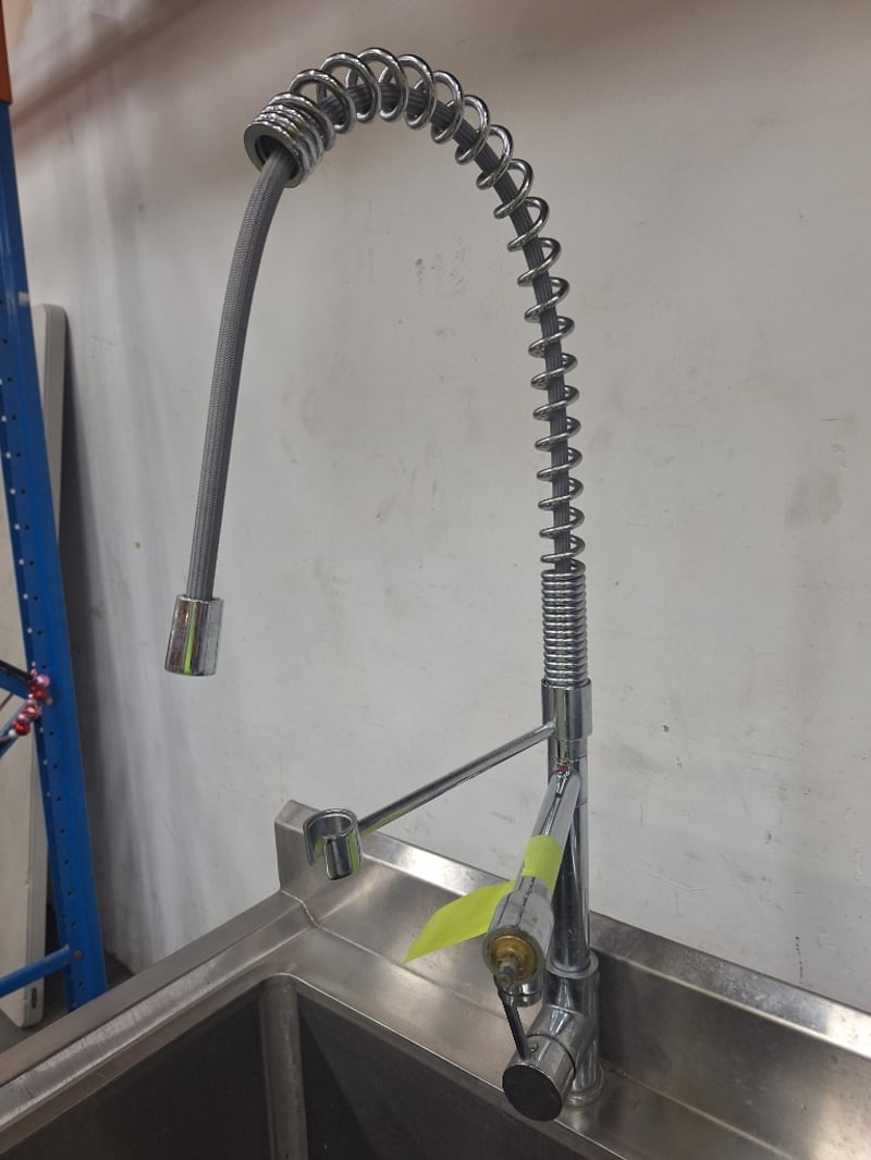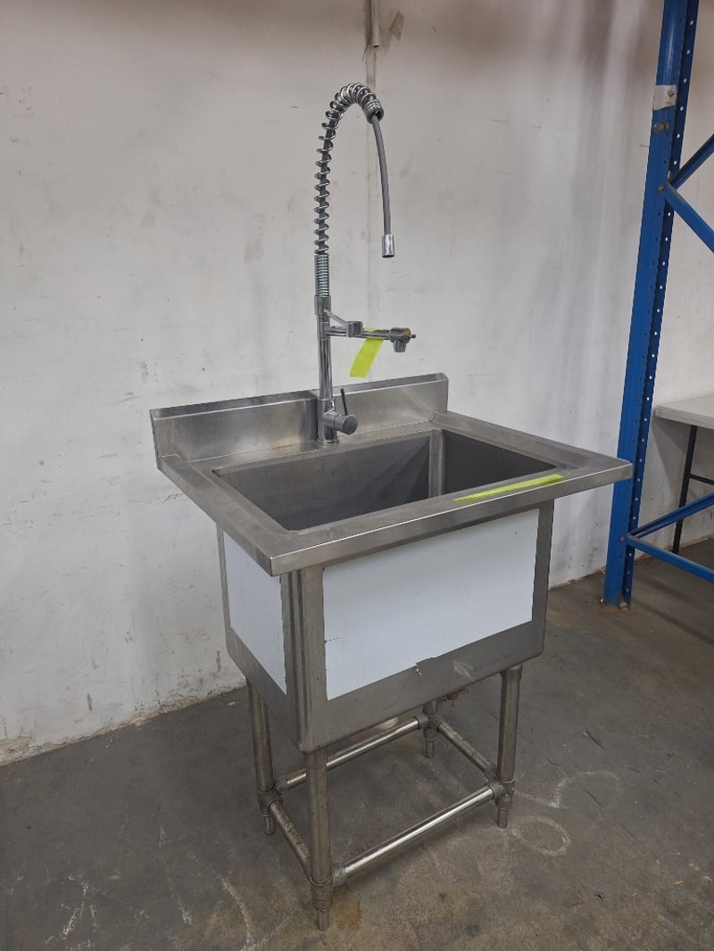 S/S Sink Bench With Splashback & Pre Rinse Spray Arm, Stainless Steel, Scratches & DentsDimensions H:105.5cm W:77cm D:60cm