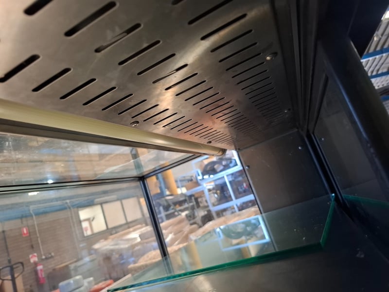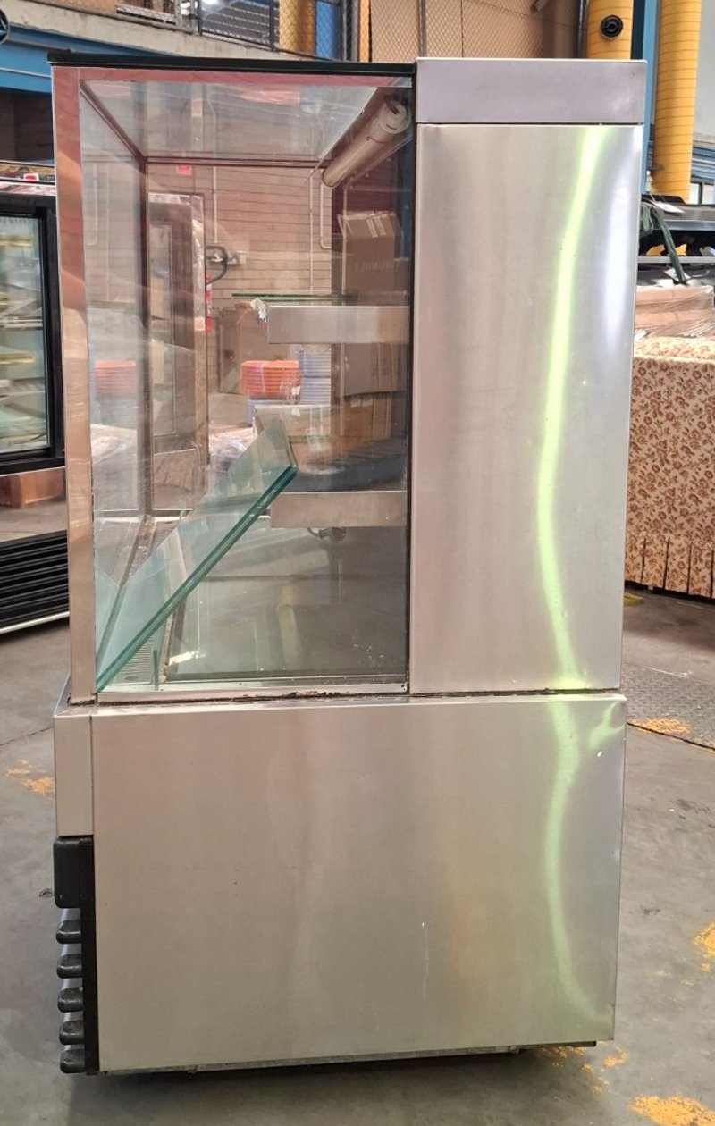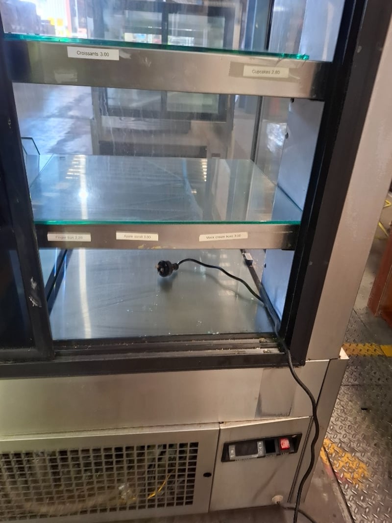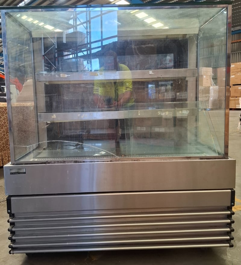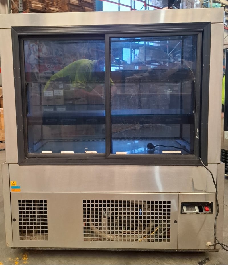 Koldtech display fridge. With light 3 shelves, 2 rear doors for access. Has scratches on metal surfaces and a crack in the front glass.Dimensions H 136cm x W 115cn x D 73cmRequires cleaning.Inspection Recommended