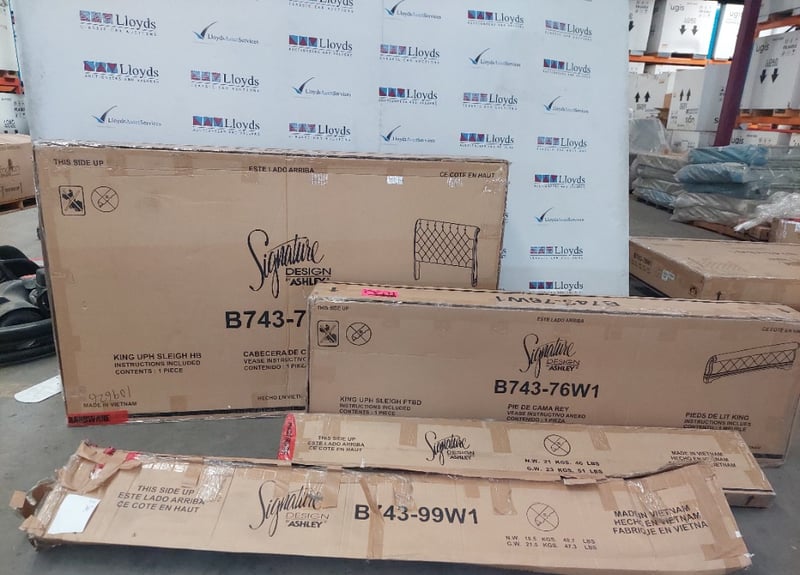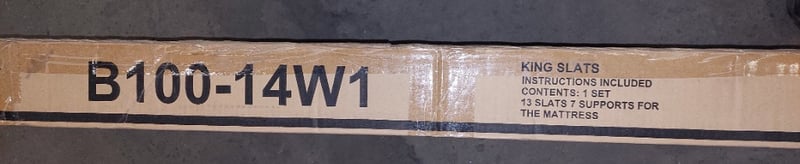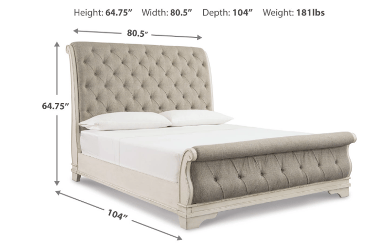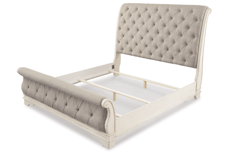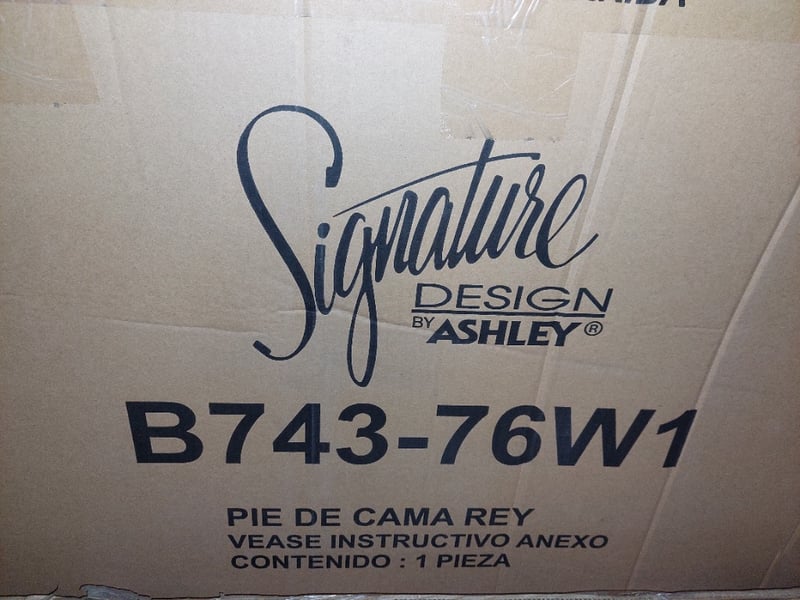 Signature design by Ashley, King-sized bed frame, includes headboard, footboard, rails, and slats. B743-78W1, B743-76W1, B743-99W1, B100- 14W1.