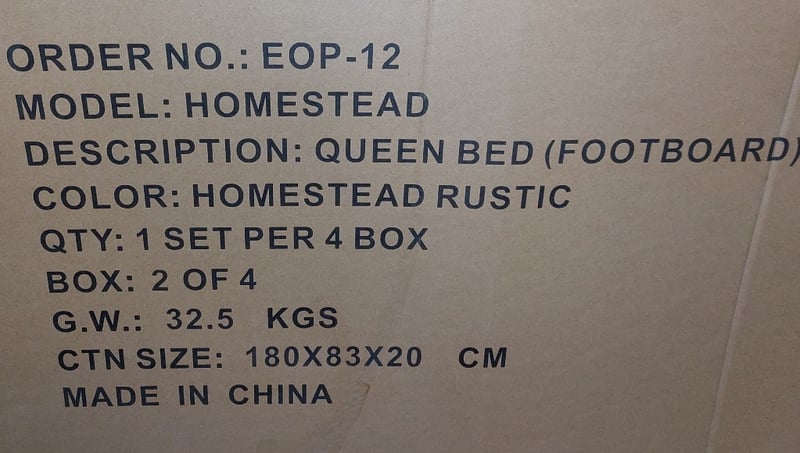 Queen sized bed frame, includes headboard, footboard, rails and slats.