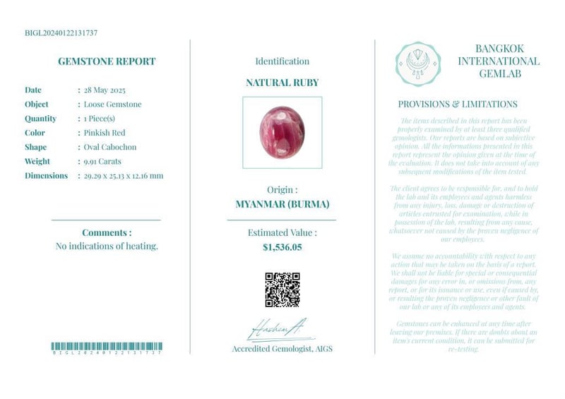 9.91 CARATS CERTIFIED NATURAL RUBY Gemstone : Natural RubyCertificate Number : Bigl20240122131737Weight : 9.91 CaratsColor : Pinkish RedMeasurement : 29.29 X 25.13 X 12.16 MmShape : Oval CabochonQuantity : 1 PieceOrigin : Myanmar (Burma)Comments : No Indications Of Heating.• Use The Qr Code On The Packaging To View And Download The Certificate. • Verify Report Online At Www.Bangkokinternationalgemlab.Co 0+2