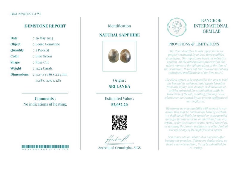 13.24 CARATS CERTIFIED NATURAL SAPPHIRE Gemstone : Natural SapphireCertificate Number : Bigl20240122131752Weight : 13.24 CaratsColor : Blue GreenMeasurement : 17.47 X 13.86 X 2.23 MmShape : Rose CutQuantity : 2 PieceOrigin : Sri LankaComments : No Indications Of Heating.• Use The Qr Code On The Packaging To View And Download The Certificate. • Verify Report Online At Www.Bangkokinternationalgemlab.Co 0+3