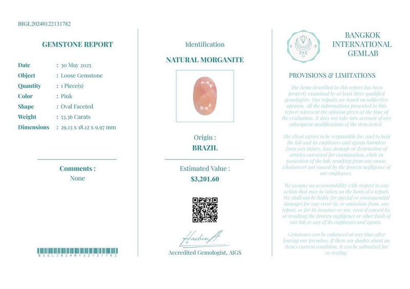 53.36 CARATS CERTIFIED NATURAL MORGANITE Gemstone : Natural MorganiteCertificate Number : Bigl20240122131782Weight : 53.36 CaratsColor : PinkMeasurement : 29.13 X 18.12 X 9.97 MmShape : Oval FacetedQuantity : 1 PieceOrigin : BrazilComments : None• Use The Qr Code On The Packaging To View And Download The Certificate. • Verify Report Online At Www.Bangkokinternationalgemlab.Co 0+5