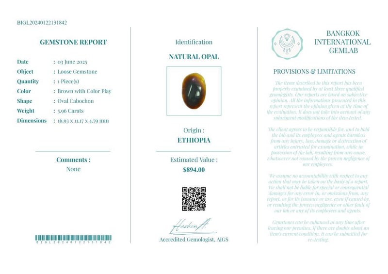 5.96 CARATS CERTIFIED NATURAL OPAL Gemstone : Natural OpalCertificate Number : Bigl20240122131842Weight : 5.96 CaratsColor : Brown With Color PlayMeasurement : 16.93 X 11.17 X 4.79 MmShape : Oval CabochonQuantity : 1 PieceOrigin : EthiopiaComments : None• Use The Qr Code On The Packaging To View And Download The Certificate. • Verify Report Online At Www.Bangkokinternationalgemlab.Co 0+9