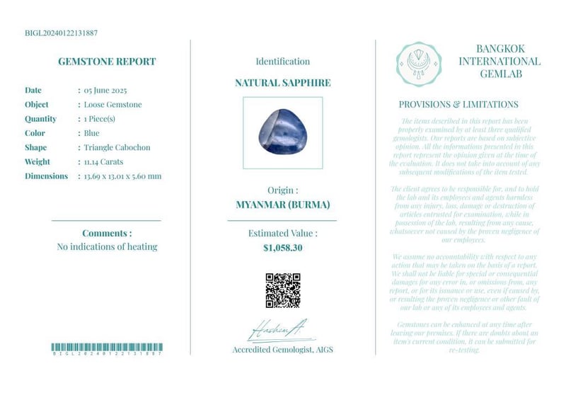 11.14 CARATS CERTIFIED NATURAL SAPPHIRE Gemstone : Natural SapphireCertificate Number : Bigl20240122131887Weight : 11.14 CaratsColor : BlueMeasurement : 13.69 X 13.01 X 5.60 MmShape : Triangle CabochonQuantity : 1 PieceOrigin : Myanmar (Burma)Comments : No Indications Of Heating• Use The Qr Code On The Packaging To View And Download The Certificate. • Verify Report Online At Www.Bangkokinternationalgemlab.Co 0+12