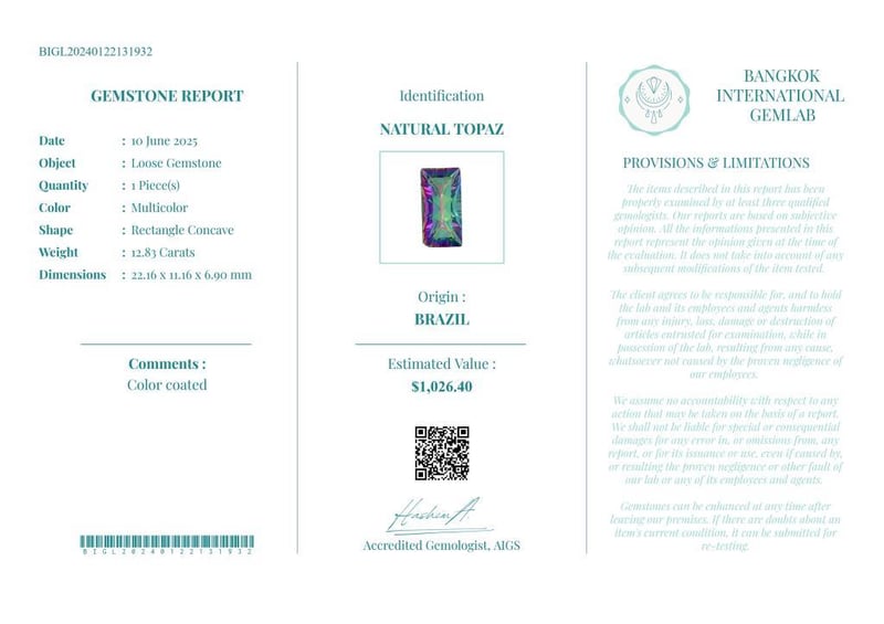 12.83 CARATS CERTIFIED NATURAL TOPAZ Gemstone : Natural TopazCertificate Number : Bigl20240122131932Weight : 12.83 CaratsColor : MulticolorMeasurement : 22.16 X 11.16 X 6.90 MmShape : Rectangle ConcaveQuantity : 1 PieceOrigin : BrazilComments : Color Coated• Use The Qr Code On The Packaging To View And Download The Certificate. • Verify Report Online At Www.Bangkokinternationalgemlab.Co 0+15