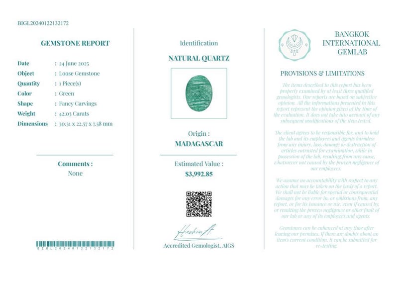 42.03 CARATS CERTIFIED NATURAL QUARTZ Gemstone : Natural QuartzCertificate Number : Bigl20240122132172Weight : 42.03 CaratsColor : GreenMeasurement : 30.31 X 22.57 X 7.58 MmShape : Fancy CarvingsQuantity : 1 PieceOrigin : MadagascarComments : None• Use The Qr Code On The Packaging To View And Download The Certificate. • Verify Report Online At Www.Bangkokinternationalgemlab.Co 0+31