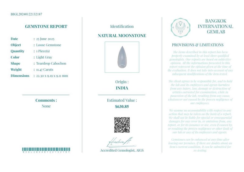 11.47 CARATS CERTIFIED NATURAL MOONSTONE Gemstone : Natural MoonstoneCertificate Number : Bigl20240122132187Weight : 11.47 CaratsColor : Light GrayMeasurement : 22.30 X 9.19 X 9.11 MmShape : Teardrop CabochonQuantity : 1 PieceOrigin : IndiaComments : None• Use The Qr Code On The Packaging To View And Download The Certificate. • Verify Report Online At Www.Bangkokinternationalgemlab.Co 0+32