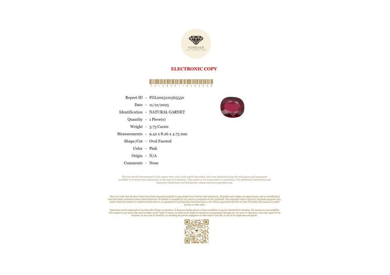 3.73 CARATS NATURAL RHODOLITE GARNET 3.73 Carats Natural GarnetCertificate Number - Fgl2025110365550Color - PinkShape - Oval FacetedDimension - 9.42 X 8.26 X 4.75 MmOrigin - N/AComments - NoneGood Quality With Luster Condition: Good - Refer Images 0488433+14
