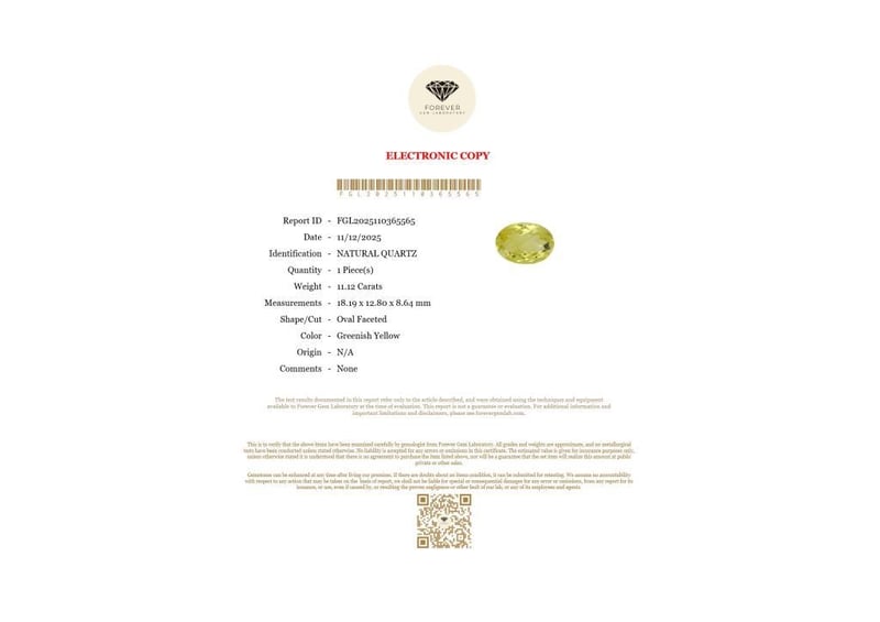 11.12 CARATS NATURAL LEMON QUARTZ 11.12 Carats Natural QuartzCertificate Number - Fgl2025110365565Color - Greenish YellowShape - Oval FacetedDimension - 18.19 X 12.80 X 8.64 MmOrigin - N/AComments - NoneGood Quality With Luster Condition: Good - Refer Images 0488433+29