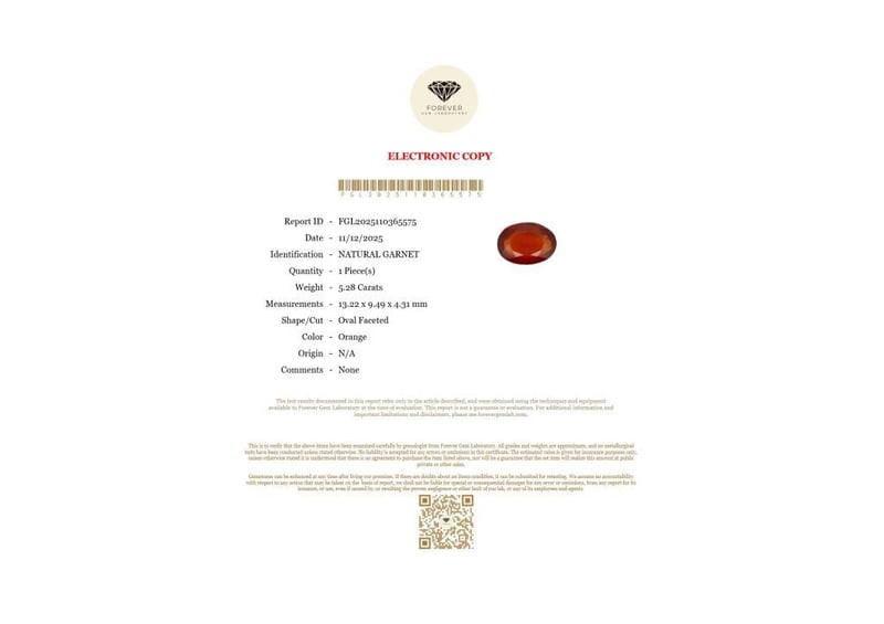 5.28 CARATS NATURAL HESSONITE GARNET 5.28 Carats Natural GarnetCertificate Number - Fgl2025110365575Color - OrangeShape - Oval FacetedDimension - 13.22 X 9.49 X 4.31 MmOrigin - N/AComments - NoneGood Quality With Luster Condition: Good - Refer Images 0488433+39