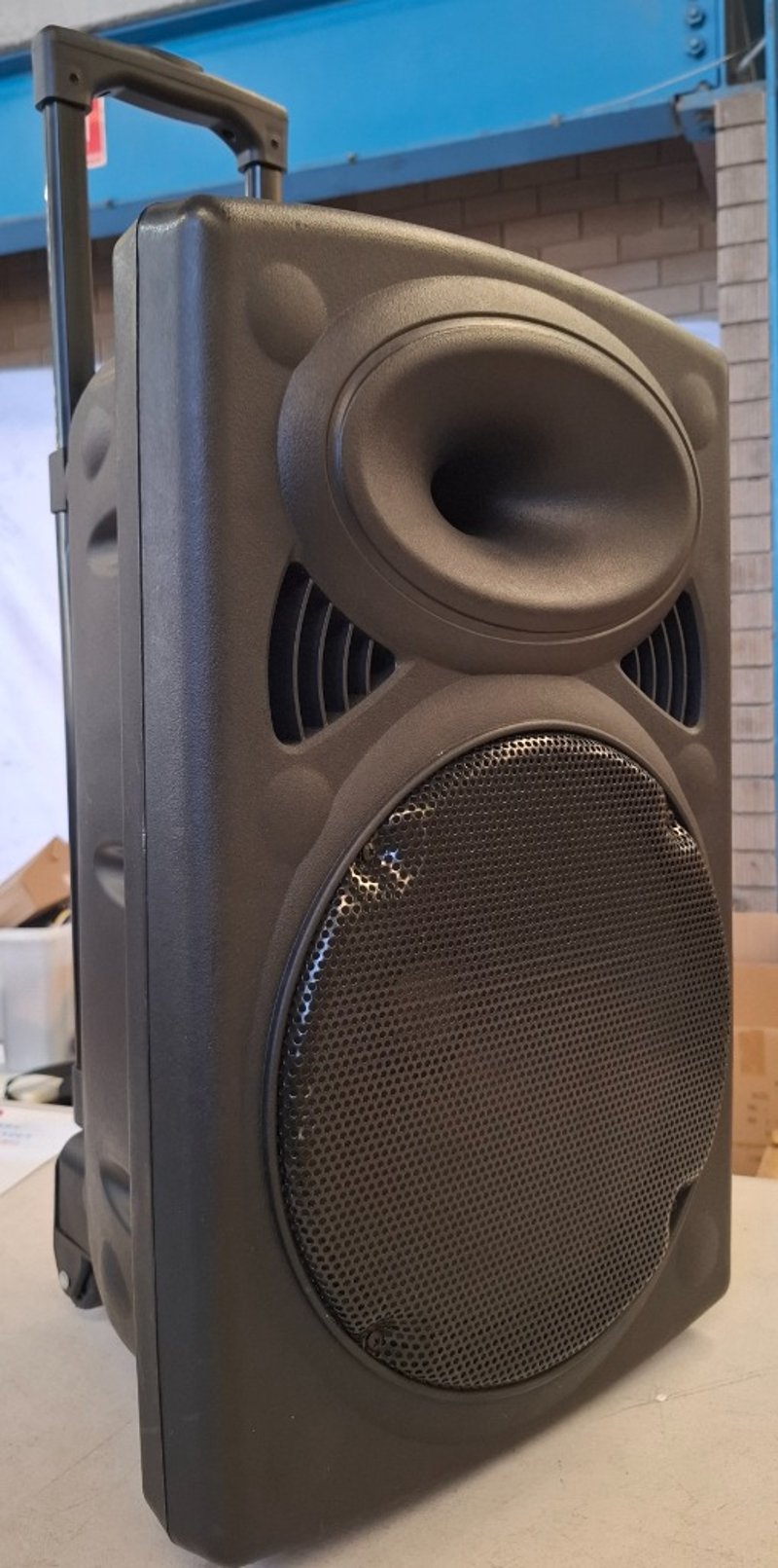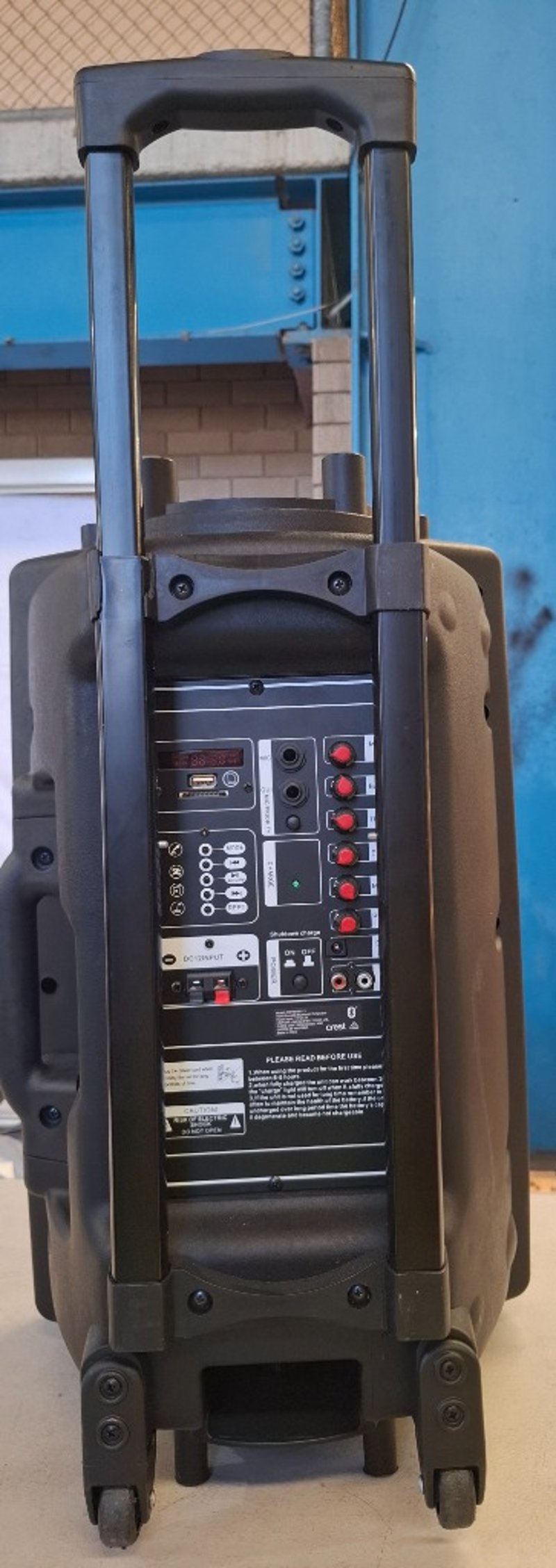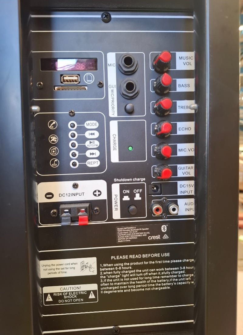 12 inch Mobile PA Sound System Bluetooth Speaker, with inputs for microphone, SD card, and audio input and USB and more. Note: No power cord Inspection Recommended