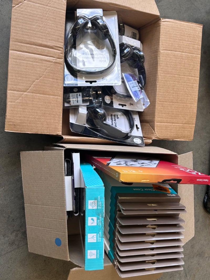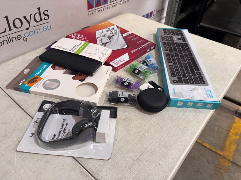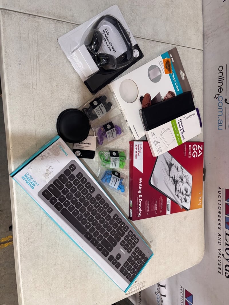 Assorted Electronic Items. Including headphones, tablet cases and keyboard.WORKING CONDITION UNKOWN NOTE: Sold as Lot
