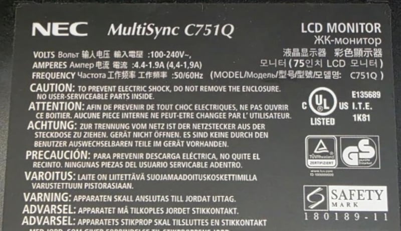 Nec Multisync LCD MONITOR 70"Model:c751qNo power cordApprox Dimensions: 169W x 96H x 10D.