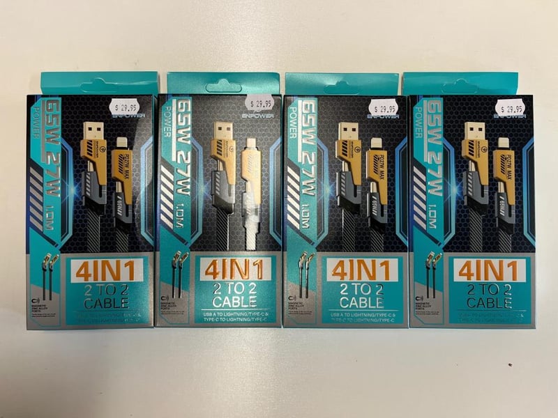 4 X Cable 4in1 Type A/C to TypeC/iPhone 65W Type C / 27W Type A Charging Configure as: (1) C to C (2) C to iPhone (3) A to C (4) A to iPhone Hinged Converters Brand New Sold as 1 Lot