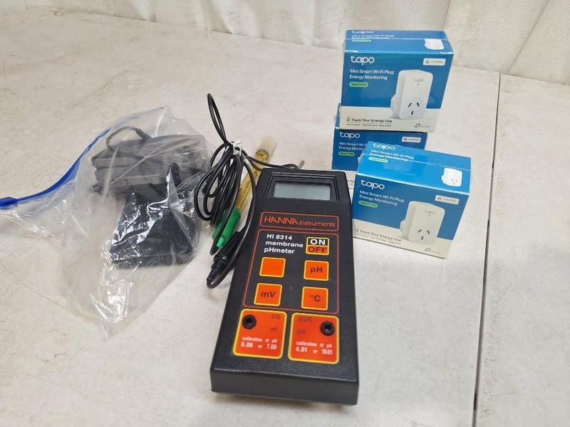 3 x TAPO Mini Smart Wi-Fi plug energy monoring, NEW factory sealed in boxes, 1 x HANNA Instruments Hi 8314 membrane PH meter, 1 x power bank, 1 x phone charger