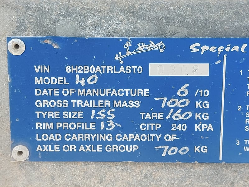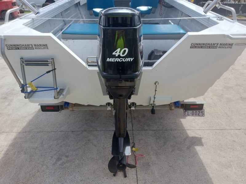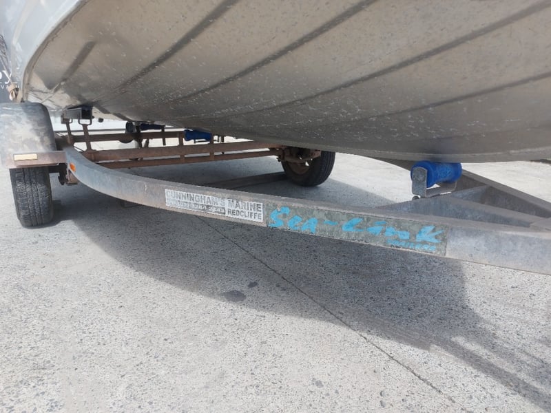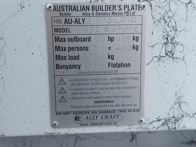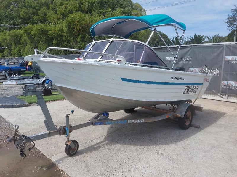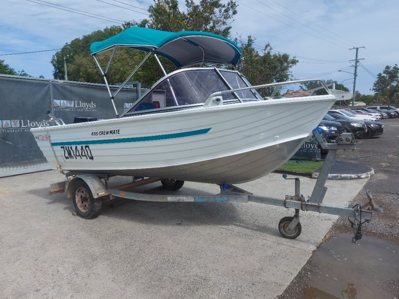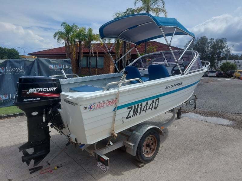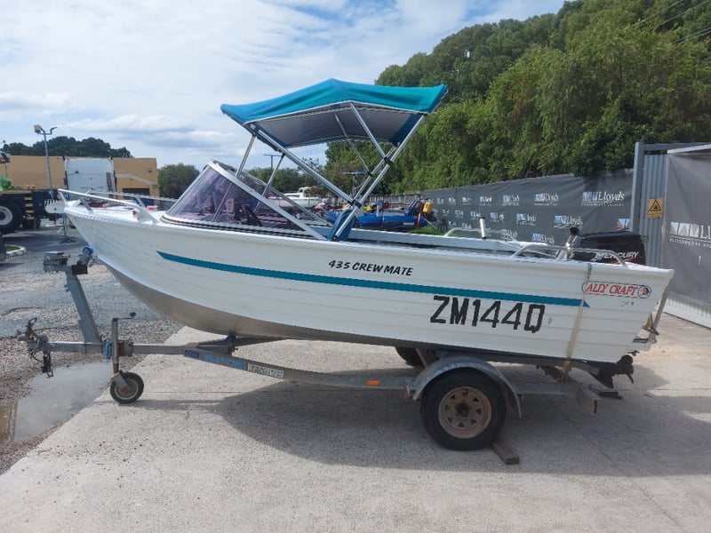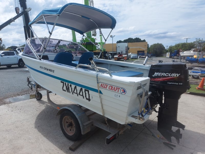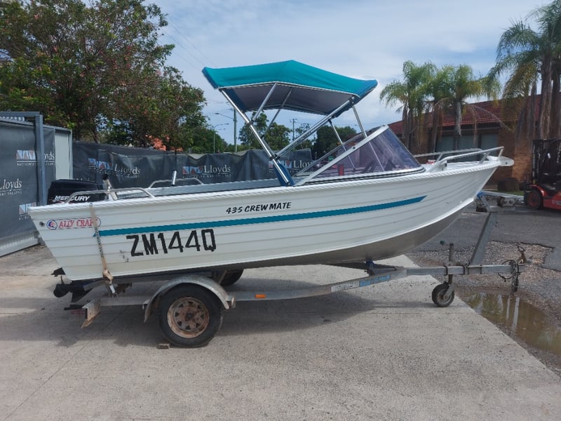 2012 Ally Craft 435 Crew Mate Boat On a Trailer Year: 2012 Make: Ally Craft Model: 435 Crew Mate Body: Runabout Hull Material: Aluminium Capacity: 5 Colour: White Engine: 40HP 2 Stroke Mercury Lightning Engine Model: Lightning Engine no: 1E40412FL Engine Hours Indicating: ~50hrs Description: 2x25 Litre Fuel Tanks, Lowrance X-4 Sounder, Garmin GPSmap 451 Satellite Navigation Unit, New Floor, Marine Carpet, Rear Lounge with Storage, Front Swivel Seats New Bimini, All Safety Equipment, Oars, Anchor, Outboard & Trailer Recently Serviced Total length on trailer: ~4.55m Trailer width: ~2.0m HIN: AU-ALY21870L910 Vessel length: ~4.35m ON A TRAILER: Year: 2010 Make: SEA LINK Model: 40 Body: Boat Trailer Colour: Silver Material: Aluminium Configuration: Single Axle Suspension: Leaf Spring Description: 50mm Towball Connection, 7 Pin Connector, Winch System, Jockey Wheel, VIN: 6H2B0ATRLAST00308 GTM: 700kg Tare: 160kg Total length: ~4.40m Key# MMR9 Carrara #MMR