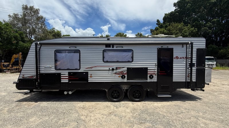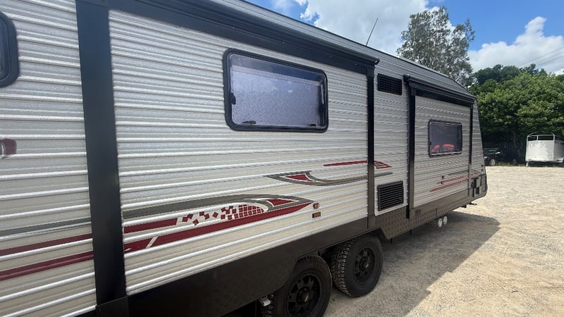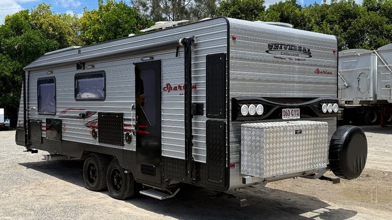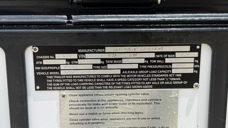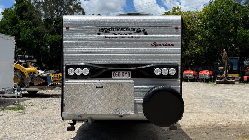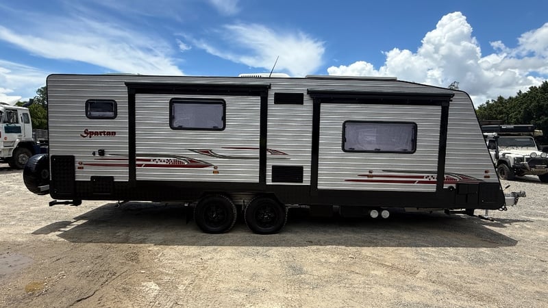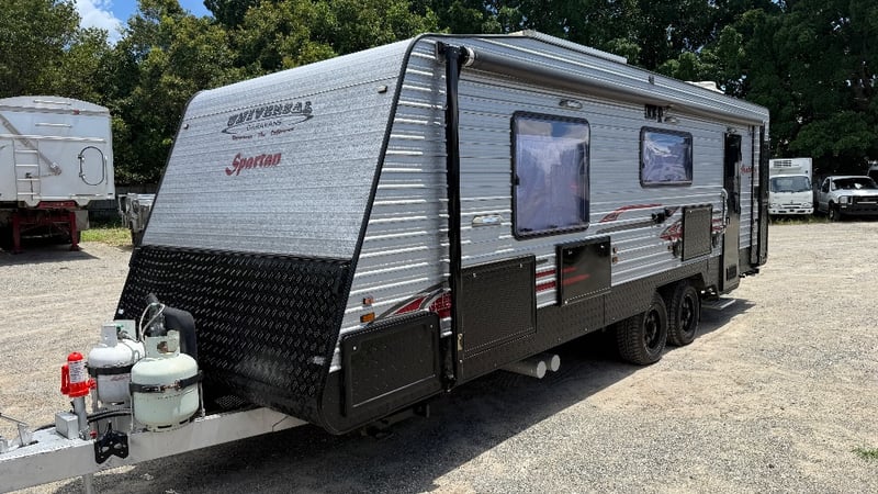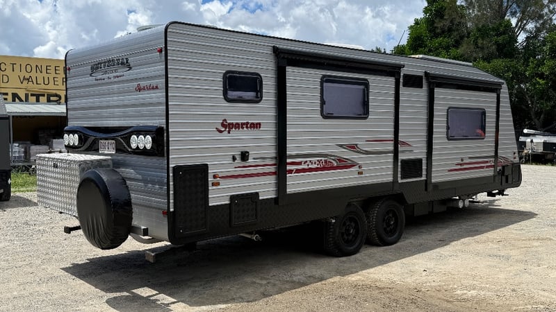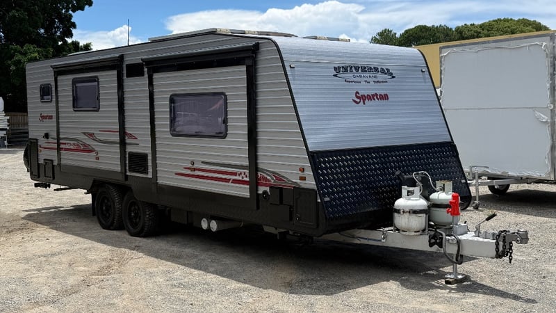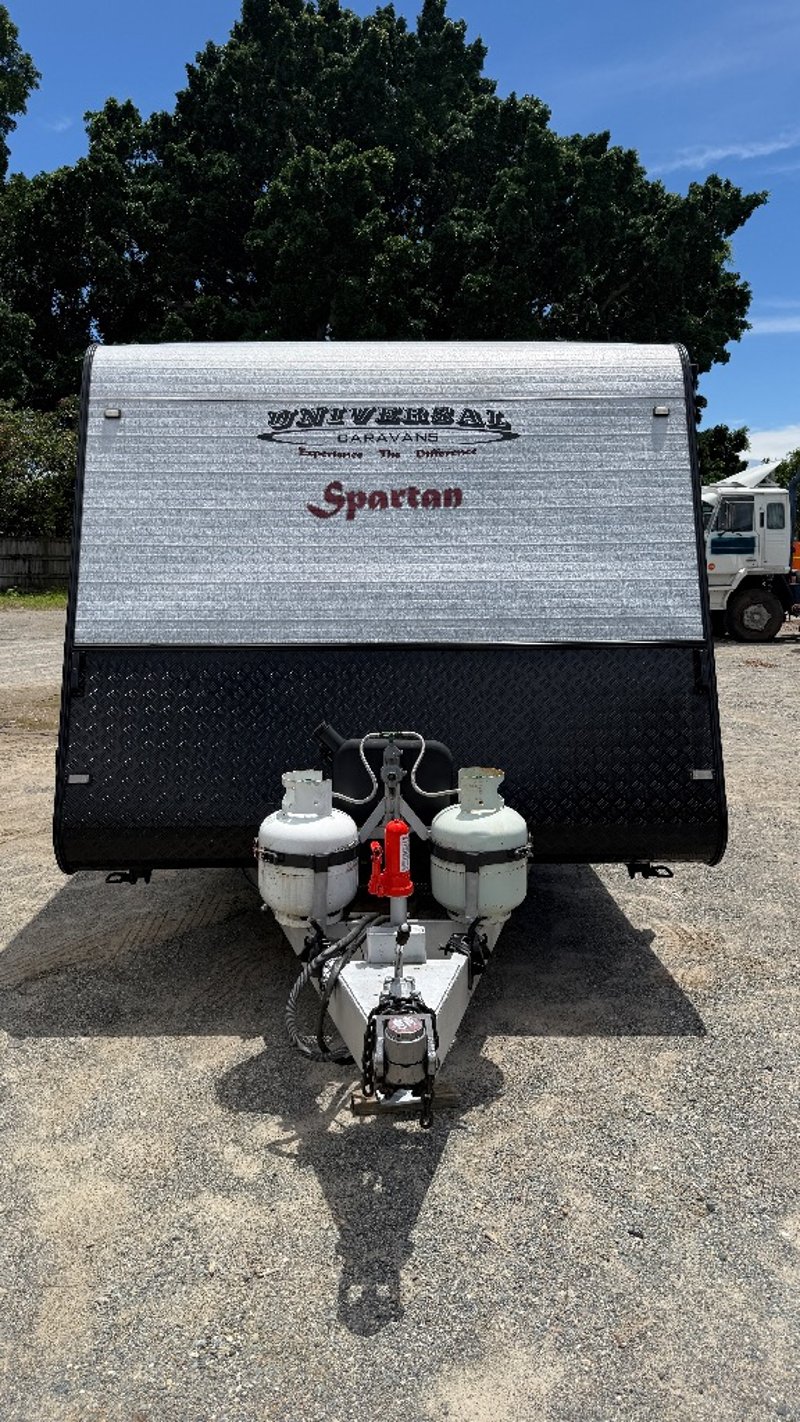 2014 Universal Caravans Spartan – 25’7” Double Slide Touring CaravanKey Specifications • Overall Length: 25’7” • Layout: Double slide-out • Axles: Tandem axle • ATM: 4,500 kg • GTM: 4,220 kg • Tyres: 235/75R15 (1250 kg rating each) • Gas: Certified LPG system (compliance plates fitted)Power & Off-Grid Setup • 2 × Solar panels • 2 × Batteries • Large inverter • Runs everything except microwave and air conditioner • Diesel heating installedExterior Features • Full front checker-plate stone guard • Roll-out awning • Double slide-outs • Large front toolbox • Dual gas bottles on drawbar • Multiple external storage lockers • Heavy-duty chassis and drawbarInterior & Living • Front café dinette with leather seating • Converts to bed • Rear island bed • Full-height mirrored wardrobes • Extensive overhead and lower storage throughout • Modern interior finish with neutral tones • LED lighting • Air conditioningKitchen & Appliances • 3-way fridge • Microwave • Oven & cooktop • Stainless sink with drainer • Ample bench space and cabinetryEntertainment & Comfort • 3 × 32” televisions • Satellite TV dish • Stereo system with DVD & CD player (all-in-one)Bathroom • Toilet • Vanity with glass bowl sink • Mirrored storage cabinets • Shelving and storageExtras • 3 kg washing machine • Diesel heating system • Fully equipped for extended touringVIN: 6T9T21V97E0E0J075#MMR